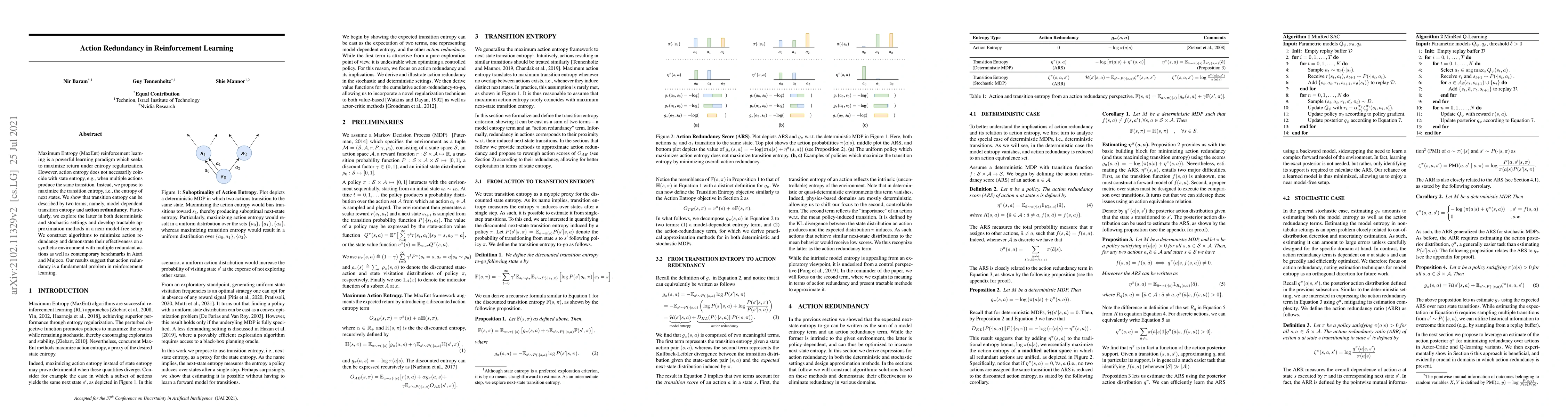 Maximum Entropy (MaxEnt) reinforcement learning is a powerful learning paradigm which seeks to maximize return under entropy regularization. However, action entropy does not necessarily coincide with state entropy, e.g., when multiple actions produce the same transition. Instead, we propose to maximize the transition entropy, i.e., the entropy of next states. We show that transition entropy can be described by two terms; namely, model-dependent transition entropy and action redundancy. Particularly, we explore the latter in both deterministic and stochastic settings and develop tractable approximation methods in a near model-free setup. We construct algorithms to minimize action redundancy and demonstrate their effectiveness on a synthetic environment with multiple redundant actions as well as contemporary benchmarks in Atari and Mujoco. Our results suggest that action redundancy is a fundamental problem in reinforcement learning.