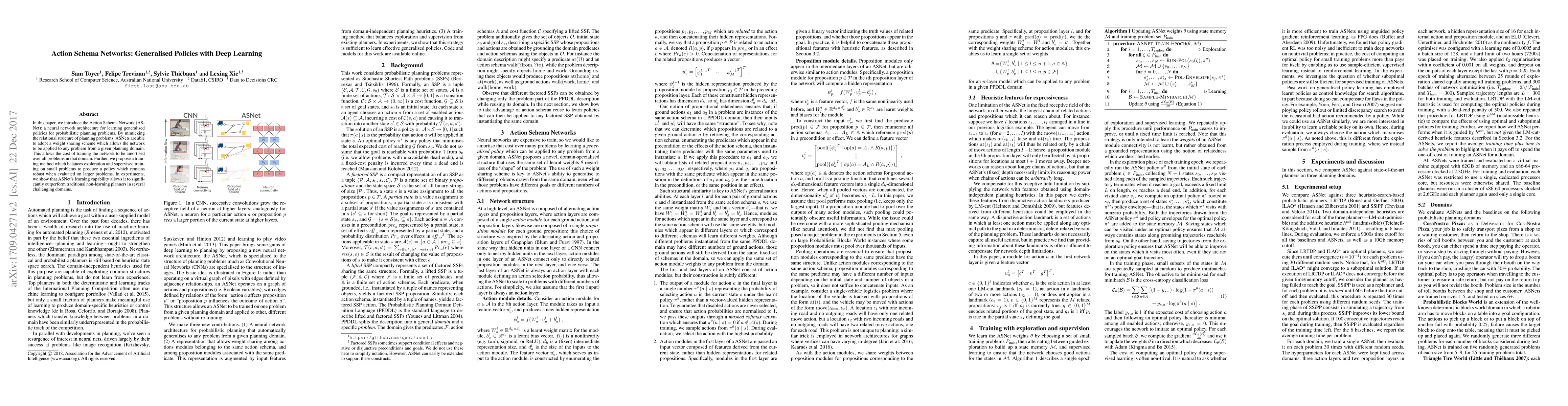 This paper introduces Action Schema Networks (ASNets), a deep learning architecture that enables generalised policies for probabilistic planning problems, outperforming traditional planners in multiple domains through amortised training and exploration-exploitation balancing.
