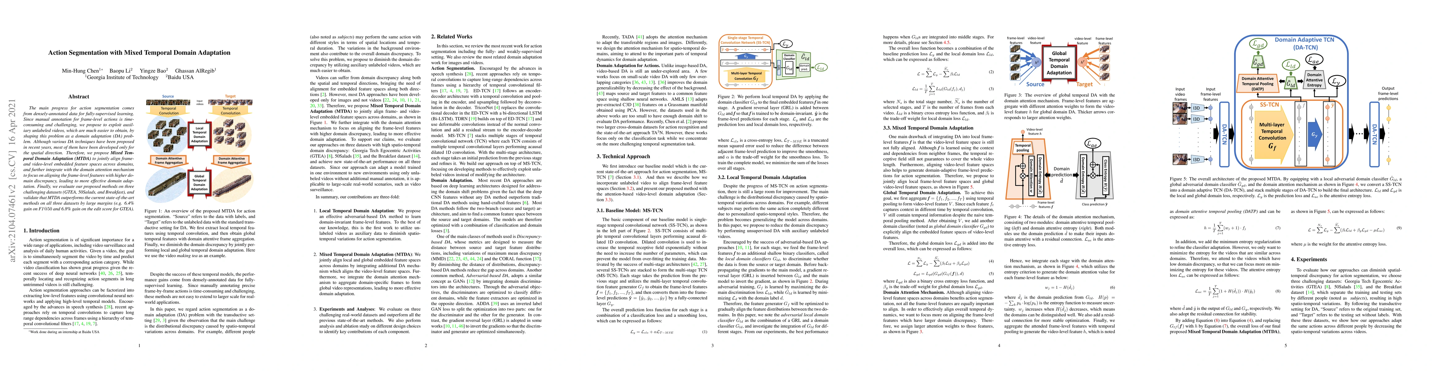 The main progress for action segmentation comes from densely-annotated data for fully-supervised learning. Since manual annotation for frame-level actions is time-consuming and challenging, we propose to exploit auxiliary unlabeled videos, which are much easier to obtain, by shaping this problem as a domain adaptation (DA) problem. Although various DA techniques have been proposed in recent years, most of them have been developed only for the spatial direction. Therefore, we propose Mixed Temporal Domain Adaptation (MTDA) to jointly align frame- and video-level embedded feature spaces across domains, and further integrate with the domain attention mechanism to focus on aligning the frame-level features with higher domain discrepancy, leading to more effective domain adaptation. Finally, we evaluate our proposed methods on three challenging datasets (GTEA, 50Salads, and Breakfast), and validate that MTDA outperforms the current state-of-the-art methods on all three datasets by large margins (e.g. 6.4% gain on F1@50 and 6.8% gain on the edit score for GTEA).