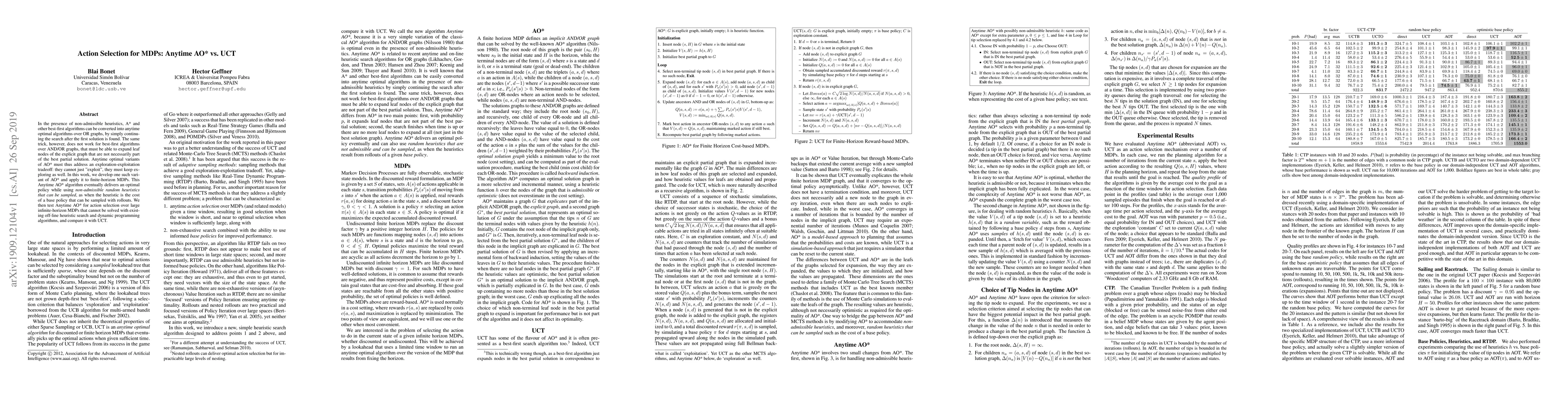This paper proposes an Anytime AO* algorithm for action selection in finite-horizon MDPs that uses non-admissible heuristics, contrasting it with UCT for large infinite-horizon MDPs. It addresses the exploration-exploitation tradeoff inherent in anytime optimal algorithms over AND/OR graphs.