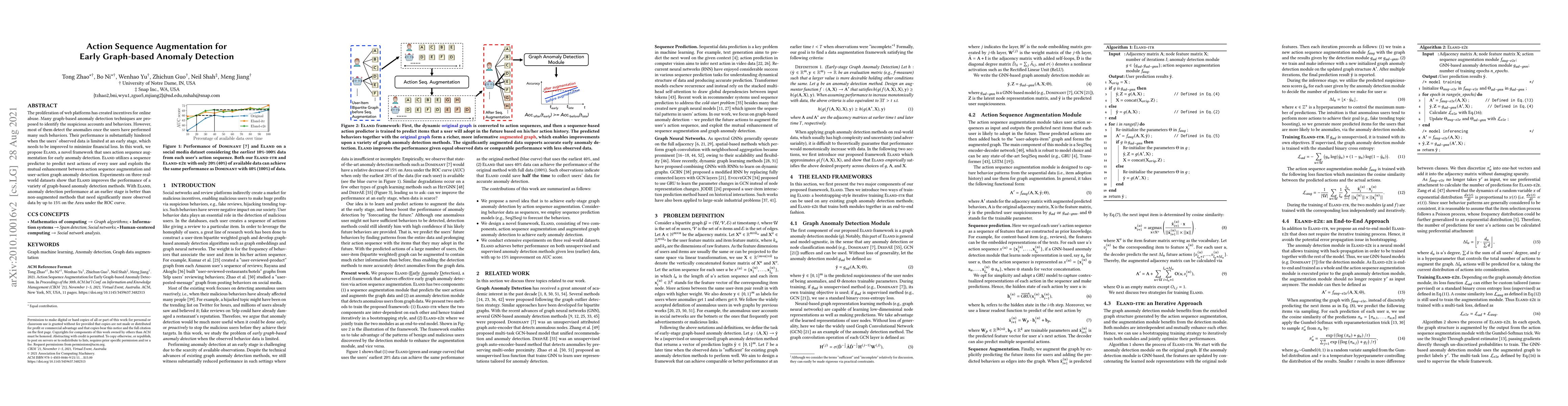 The proliferation of web platforms has created incentives for online abuse. Many graph-based anomaly detection techniques are proposed to identify the suspicious accounts and behaviors. However, most of them detect the anomalies once the users have performed many such behaviors. Their performance is substantially hindered when the users' observed data is limited at an early stage, which needs to be improved to minimize financial loss. In this work, we propose Eland, a novel framework that uses action sequence augmentation for early anomaly detection. Eland utilizes a sequence predictor to predict next actions of every user and exploits the mutual enhancement between action sequence augmentation and user-action graph anomaly detection. Experiments on three real-world datasets show that Eland improves the performance of a variety of graph-based anomaly detection methods. With Eland, anomaly detection performance at an earlier stage is better than non-augmented methods that need significantly more observed data by up to 15% on the Area under the ROC curve.