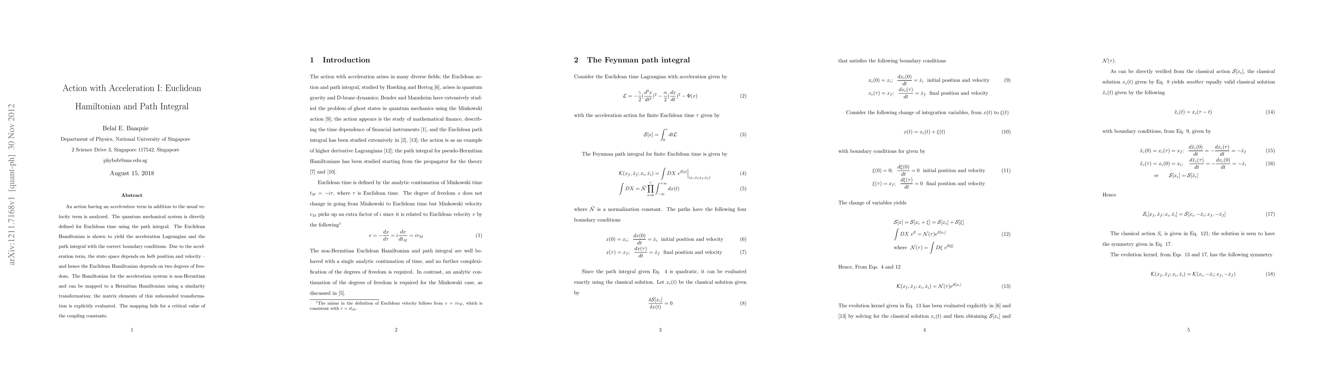 An action having an acceleration term in addition to the usual velocity term is analyzed. The quantum mechanical system is directly defined for Euclidean time using the path integral. The Euclidean Hamiltonian is shown to yield the acceleration Lagrangian and the path integral with the correct boundary conditions. Due to the acceleration term, the state space depends on both position and velocity, and hence the Euclidean Hamiltonian depends on two degrees of freedom. The Hamiltonian for the acceleration system is non-Hermitian and can be mapped to a Hermitian Hamiltonian using a similarity transformation; the matrix elements of this unbounded transformation is explicitly evaluated. The mapping fails for a critical value of the coupling constants.