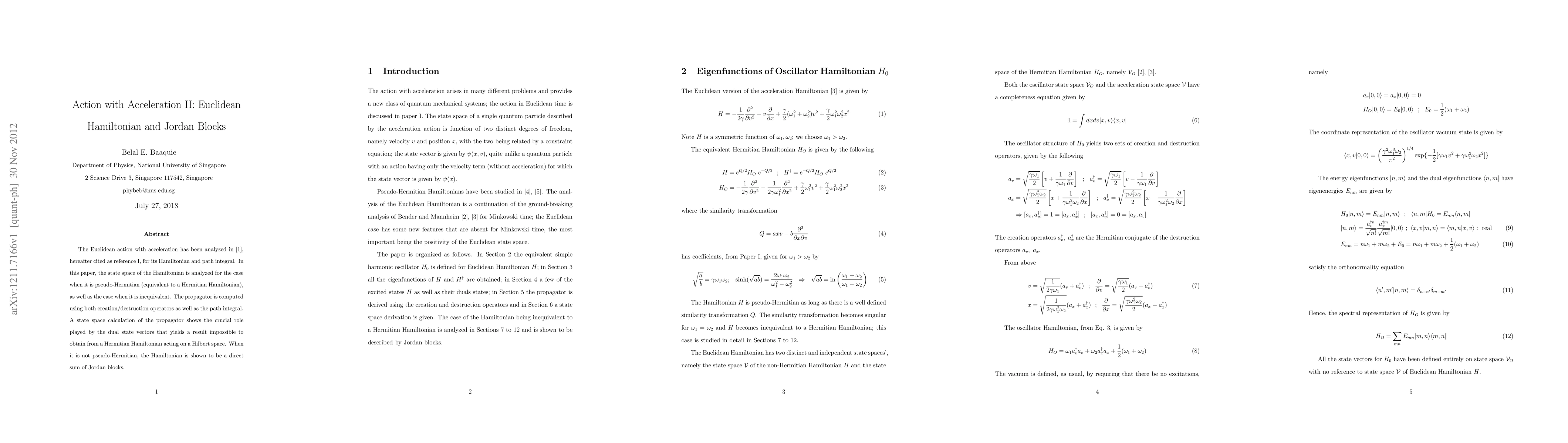 The Euclidean action with acceleration has been analyzed in [1], hereafter cited as reference I, for its Hamiltonian and path integral. In this paper, the state space of the Hamiltonian is analyzed for the case when it is pseudo-Hermitian (equivalent to a Hermitian Hamiltonian), as well as the case when it is inequivalent. The propagator is computed using both creation/destruction operators as well as the path integral. A state space calculation of the propagator shows the crucial role played by the dual state vectors that yields a result impossible to obtain from a Hermitian Hamiltonian acting on a Hilbert space. When it is not pseudo-Hermitian, the Hamiltonian is shown to be a direct sum of Jordan blocks.