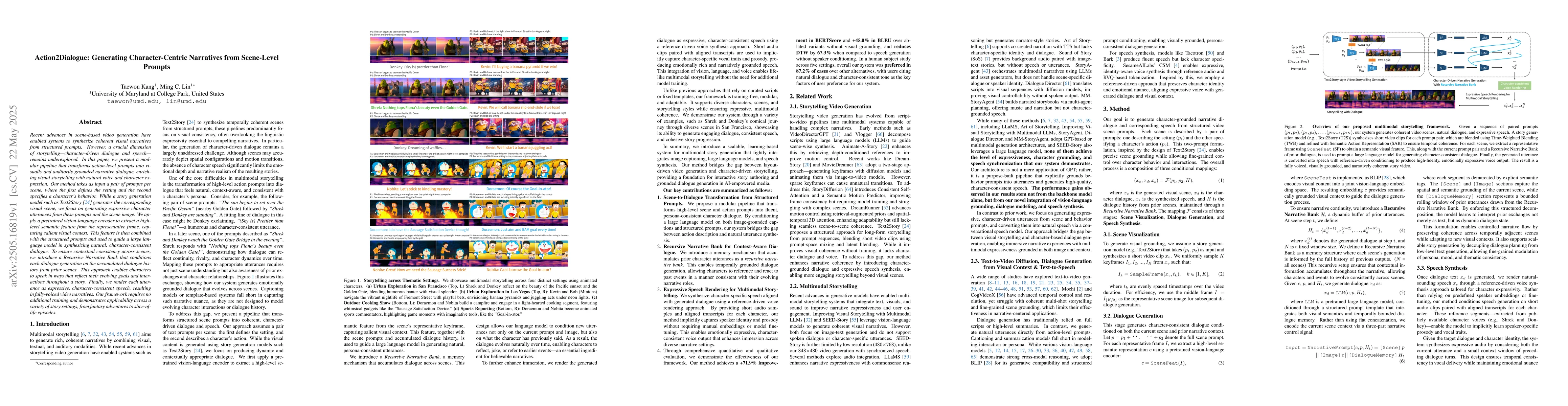 The paper presents a modular pipeline that generates character-centric narratives from scene-level prompts, integrating vision-language models, large language models, and speaker-conditioned text-to-speech synthesis to capture visual semantics and temporal narrative flow.