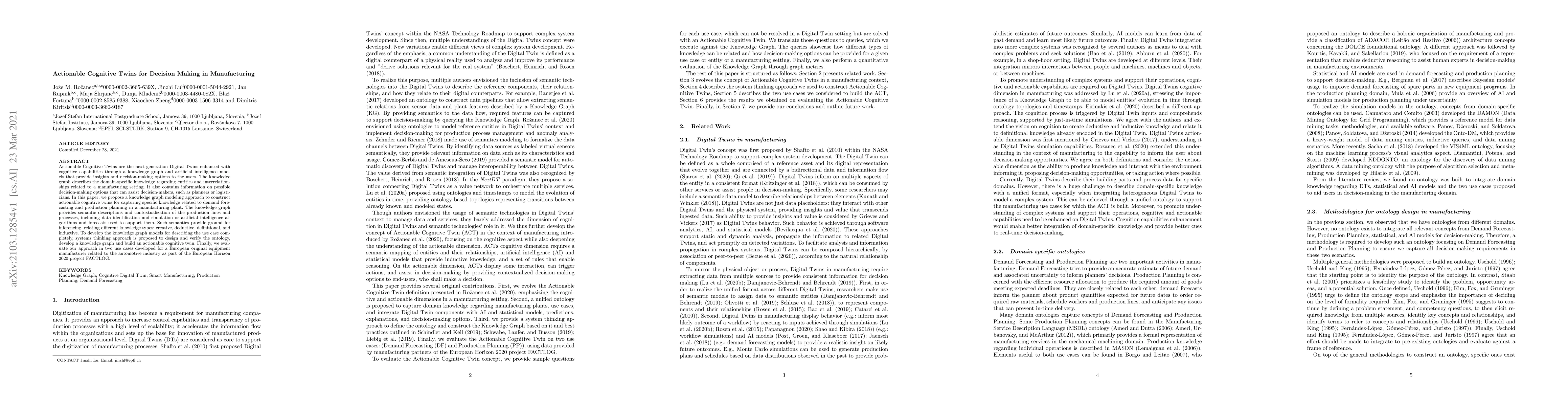 This paper proposes a knowledge graph modeling approach to create Actionable Cognitive Twins—enhanced Digital Twins with cognitive capabilities—to aid decision-making in manufacturing. These twins provide insights and decision-making options through semantic descriptions and contextualization of production processes, evaluated in use cases for an automotive manufacturer.