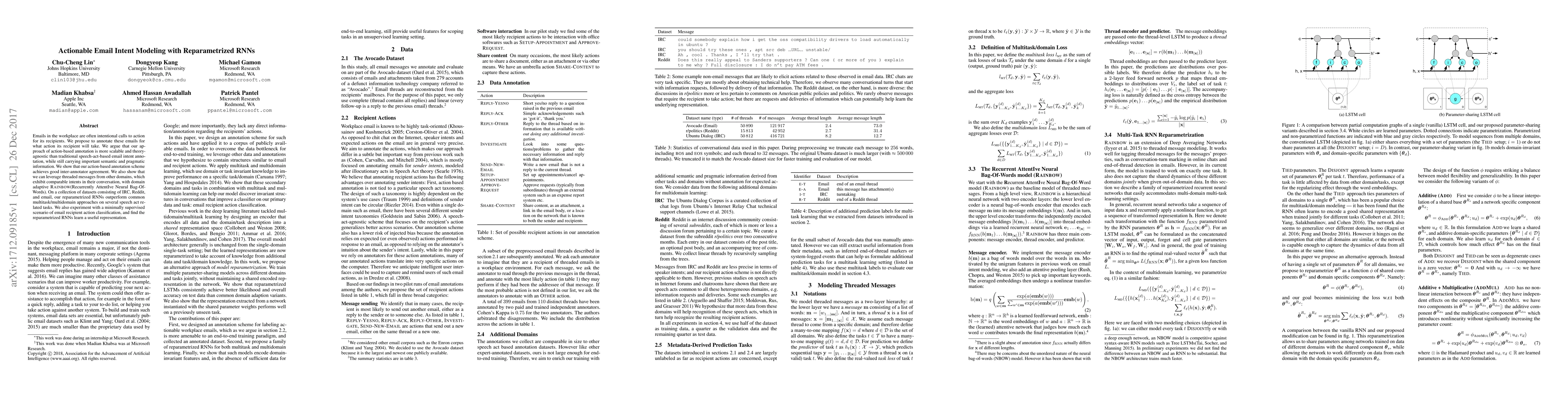 Emails in the workplace are often intentional calls to action for its recipients. We propose to annotate these emails for what action its recipient will take. We argue that our approach of action-based annotation is more scalable and theory-agnostic than traditional speech-act-based email intent annotation, while still carrying important semantic and pragmatic information. We show that our action-based annotation scheme achieves good inter-annotator agreement. We also show that we can leverage threaded messages from other domains, which exhibit comparable intents in their conversation, with domain adaptive RAINBOW (Recurrently AttentIve Neural Bag-Of-Words). On a collection of datasets consisting of IRC, Reddit, and email, our reparametrized RNNs outperform common multitask/multidomain approaches on several speech act related tasks. We also experiment with a minimally supervised scenario of email recipient action classification, and find the reparametrized RNNs learn a useful representation.