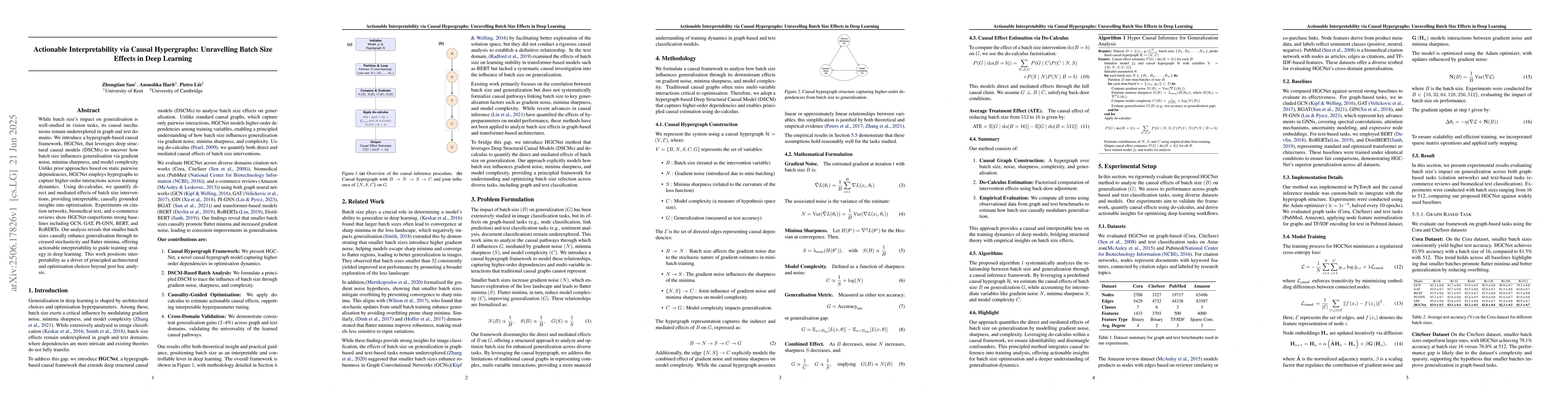 While the impact of batch size on generalisation is well studied in vision tasks, its causal mechanisms remain underexplored in graph and text domains. We introduce a hypergraph-based causal framework, HGCNet, that leverages deep structural causal models (DSCMs) to uncover how batch size influences generalisation via gradient noise, minima sharpness, and model complexity. Unlike prior approaches based on static pairwise dependencies, HGCNet employs hypergraphs to capture higher-order interactions across training dynamics. Using do-calculus, we quantify direct and mediated effects of batch size interventions, providing interpretable, causally grounded insights into optimisation. Experiments on citation networks, biomedical text, and e-commerce reviews show that HGCNet outperforms strong baselines including GCN, GAT, PI-GNN, BERT, and RoBERTa. Our analysis reveals that smaller batch sizes causally enhance generalisation through increased stochasticity and flatter minima, offering actionable interpretability to guide training strategies in deep learning. This work positions interpretability as a driver of principled architectural and optimisation choices beyond post hoc analysis.
