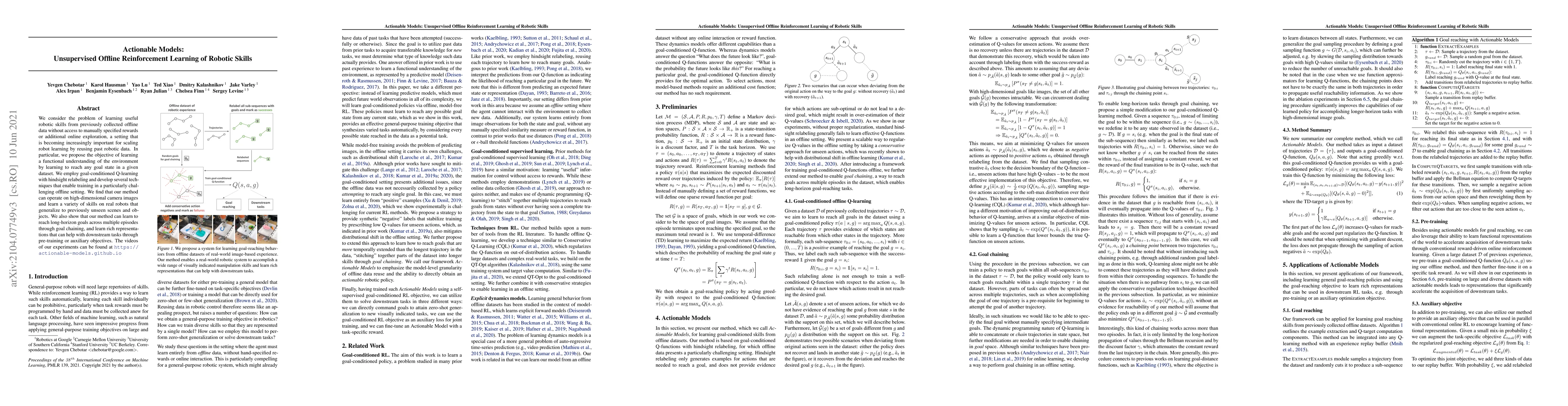 We consider the problem of learning useful robotic skills from previously collected offline data without access to manually specified rewards or additional online exploration, a setting that is becoming increasingly important for scaling robot learning by reusing past robotic data. In particular, we propose the objective of learning a functional understanding of the environment by learning to reach any goal state in a given dataset. We employ goal-conditioned Q-learning with hindsight relabeling and develop several techniques that enable training in a particularly challenging offline setting. We find that our method can operate on high-dimensional camera images and learn a variety of skills on real robots that generalize to previously unseen scenes and objects. We also show that our method can learn to reach long-horizon goals across multiple episodes through goal chaining, and learn rich representations that can help with downstream tasks through pre-training or auxiliary objectives. The videos of our experiments can be found at https://actionable-models.github.io