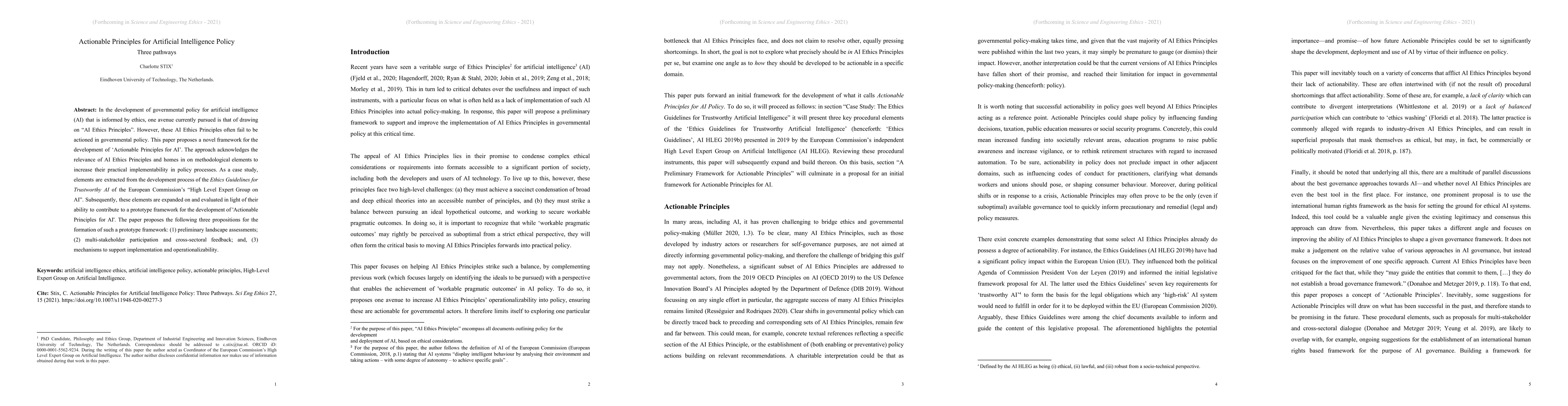 This paper proposes a framework for developing actionable AI ethics principles by focusing on practical implementation in policy processes. It suggests three pathways: preliminary landscape assessments, multi-stakeholder participation, and mechanisms for implementation support, using the European Commission's AI Ethics Guidelines as a case study.