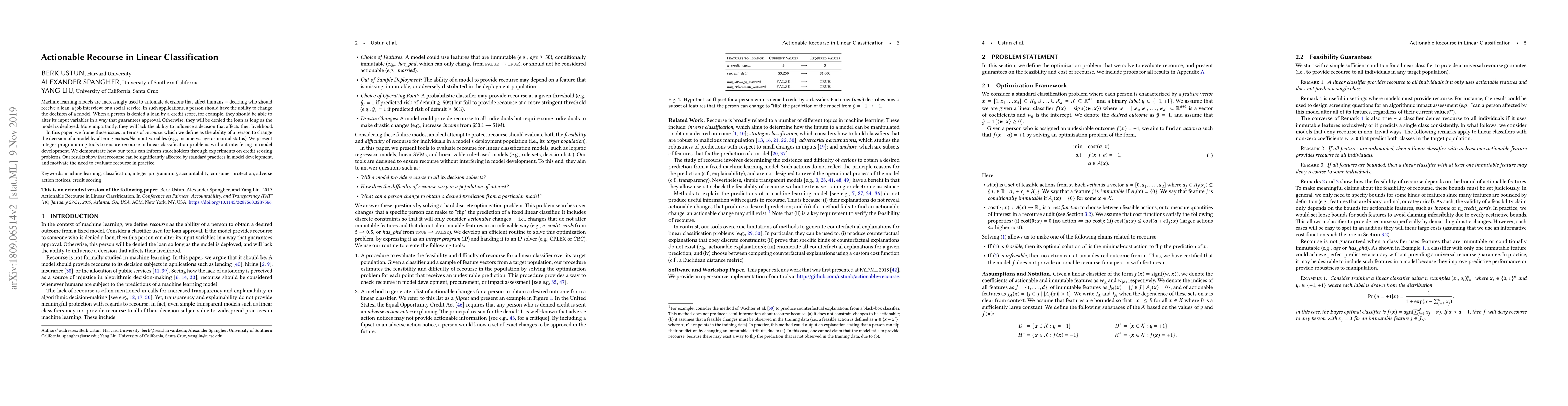 This paper explores the concept of recourse in linear classification, defining it as the ability to change a model's decision by adjusting actionable input variables. It introduces integer programming tools to ensure recourse in such models, demonstrating their effectiveness through credit scoring experiments and highlighting the importance of evaluating recourse in model development.