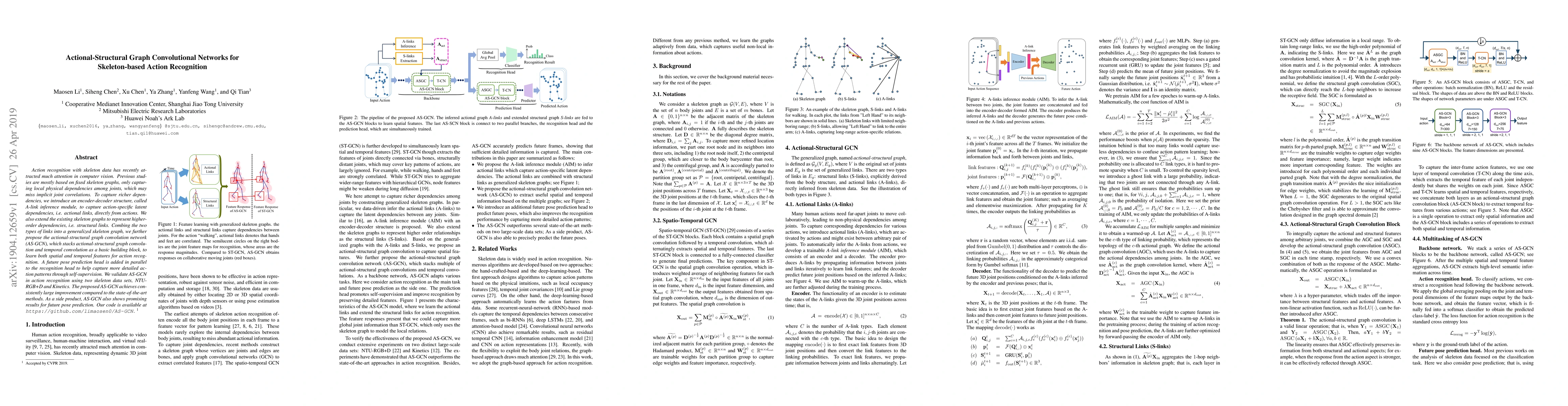 This paper proposes an actional-structural graph convolutional network (AS-GCN) for skeleton-based action recognition, combining actional links inferred from actions and structural links representing higher-order joint dependencies. The AS-GCN model achieves significant improvements over state-of-the-art methods on NTU-RGB+D and Kinetics datasets.