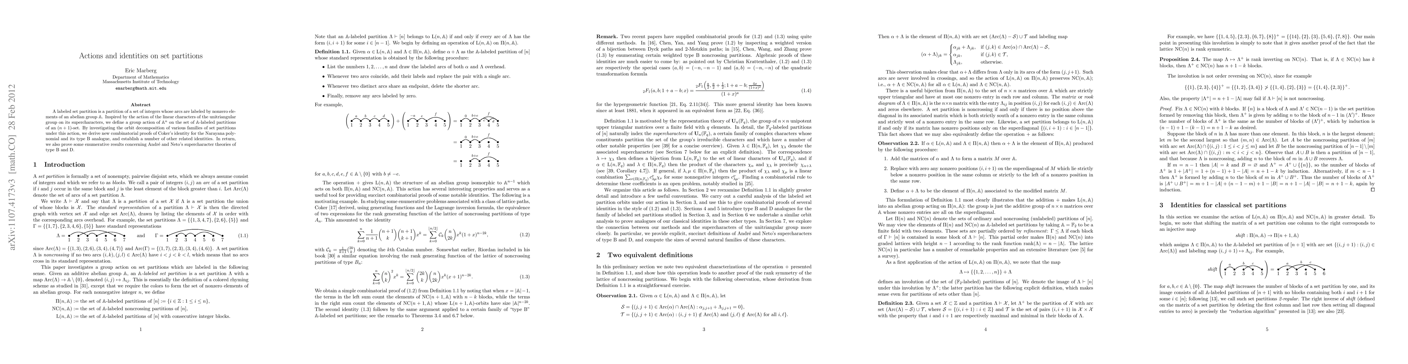 A labeled set partition is a partition of a set of integers whose arcs are labeled by nonzero elements of an abelian group $A$. Inspired by the action of the linear characters of the unitriangular group on its supercharacters, we define a group action of $A^n$ on the set of $A$-labeled partitions of an $(n+1)$-set. By investigating the orbit decomposition of various families of set partitions under this action, we derive new combinatorial proofs of Coker's identity for the Narayana polynomial and its type B analogue, and establish a number of other related identities. In return, we also prove some enumerative results concerning Andr\'e and Neto's supercharacter theories of type B and D.
