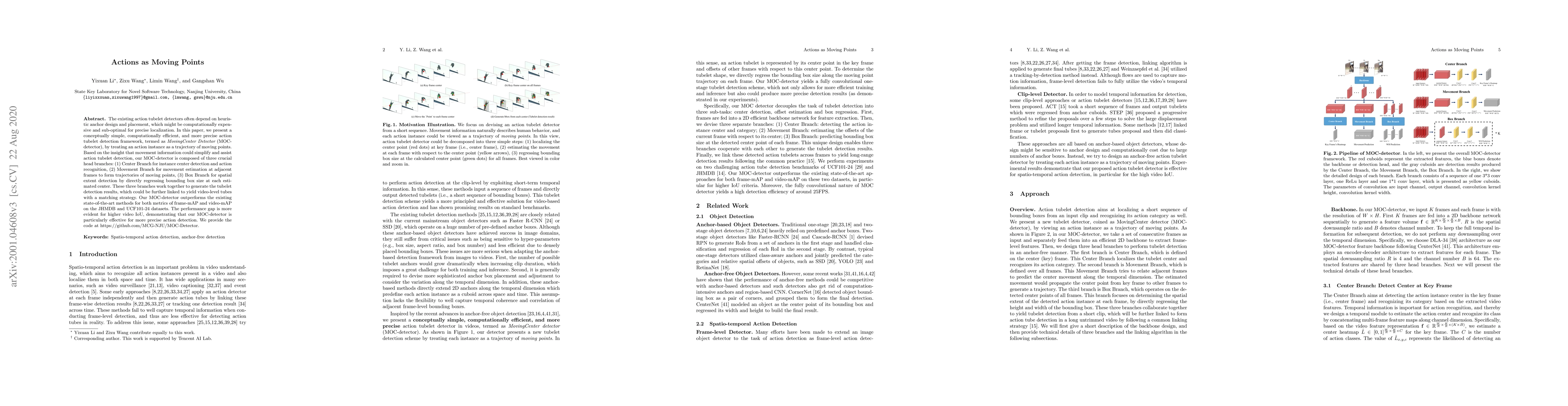 The existing action tubelet detectors often depend on heuristic anchor design and placement, which might be computationally expensive and sub-optimal for precise localization. In this paper, we present a conceptually simple, computationally efficient, and more precise action tubelet detection framework, termed as MovingCenter Detector (MOC-detector), by treating an action instance as a trajectory of moving points. Based on the insight that movement information could simplify and assist action tubelet detection, our MOC-detector is composed of three crucial head branches: (1) Center Branch for instance center detection and action recognition, (2) Movement Branch for movement estimation at adjacent frames to form trajectories of moving points, (3) Box Branch for spatial extent detection by directly regressing bounding box size at each estimated center. These three branches work together to generate the tubelet detection results, which could be further linked to yield video-level tubes with a matching strategy. Our MOC-detector outperforms the existing state-of-the-art methods for both metrics of frame-mAP and video-mAP on the JHMDB and UCF101-24 datasets. The performance gap is more evident for higher video IoU, demonstrating that our MOC-detector is particularly effective for more precise action detection. We provide the code at https://github.com/MCG-NJU/MOC-Detector.