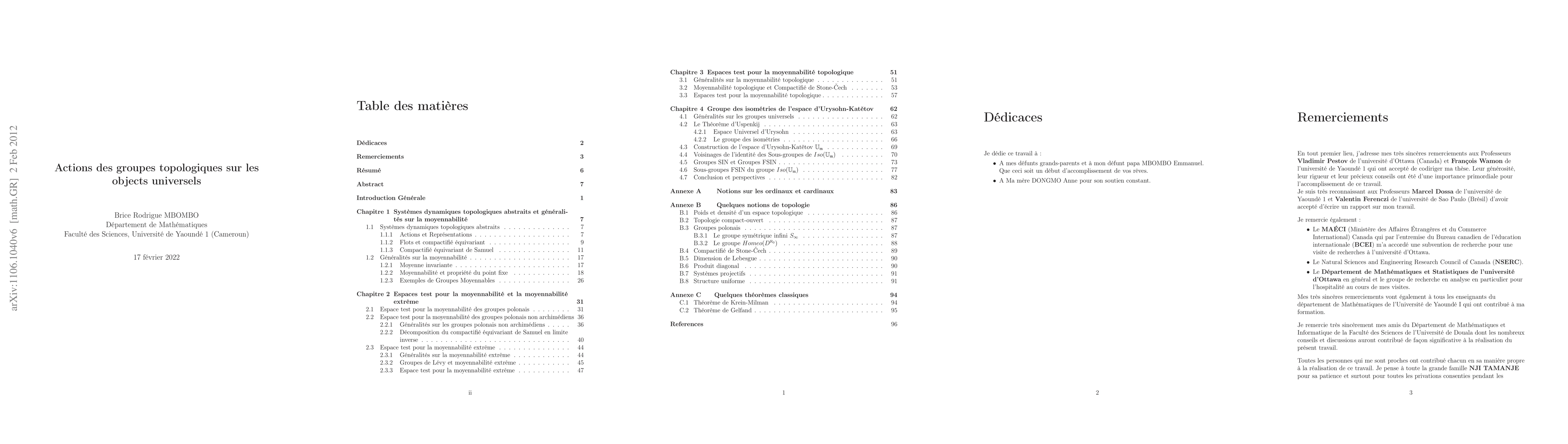 In this thesis, we study the existence of universal objets of two differents types in the theory of topological groups and theirs actions on compacts spaces. In the first part, we contribute to the problem of existence of test spaces for amenability. We observe that a Polish group is amenable if and only if its every continuous action on the Hilbert cube admits an invariant probability measure. This generalizes a result of Bogatyi and Fedorchuk. We also show that actions on the Cantor space can be used to detect amenability and extreme amenability of Polish non-archimedean groups as well as amenability at infinity of discrete countable groups. As corollary, the latter property can also be tested by actions on the Hilbert cube. These results generalise a criterion due to Giordano and de la Harpe. In the second part of this thesis we are motivated by the problem of existence of an universal topological group of uncountable weight. We show that the group of isometries of a universal Urysohn-Katetov metric space of uncountable density is not a universal group of the corresponding weight. For instance, it does not contain the group of isometries of the classical separable Urysohn metric space. This stands in sharp contrast with Uspenskij's 1990 result about the group of isometries of the classical separable Urysohn metric space being a universal Polish group.