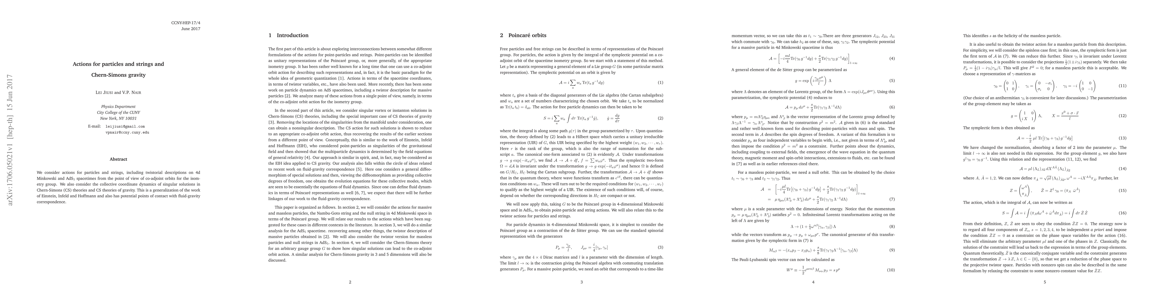 We consider actions for particles and strings, including twistorial descriptions on 4d Minkowski and AdS$_5$ spacetimes from the point of view of co-adjoint orbits for the isometry group. We also consider the collective coordinate dynamics of singular solutions in Chern-Simons (CS) theories and CS theories of gravity. This is a generalization of the work of Einstein, Infeld and Hoffmann and also has potential points of contact with fluid-gravity correspondence.