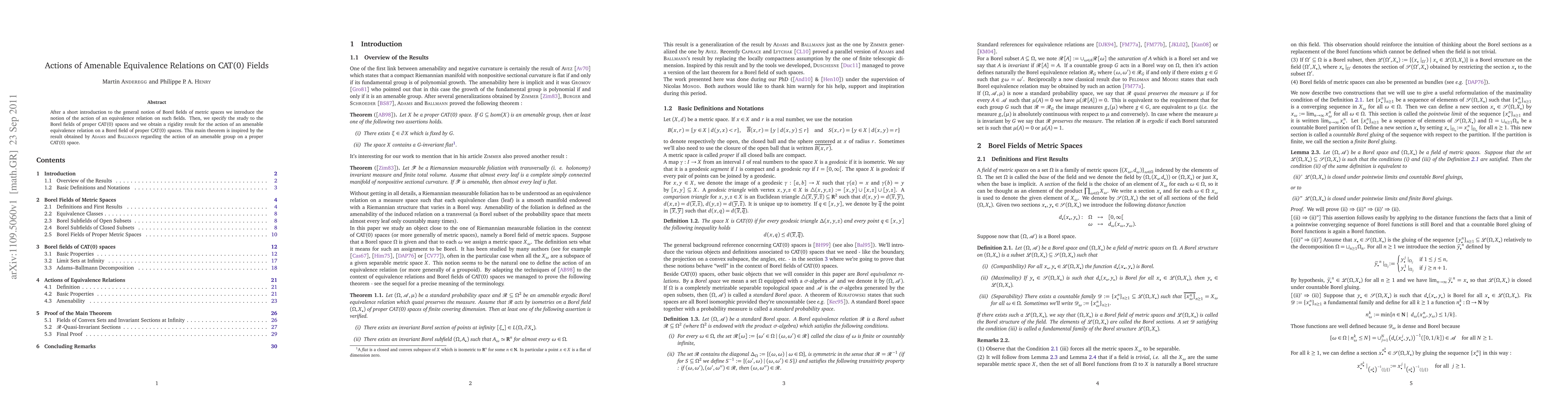 The paper introduces a framework for analyzing the action of amenable equivalence relations on Borel fields of proper CAT(0) spaces, providing a rigorous treatment of the Borel nature of related subfields and sections.