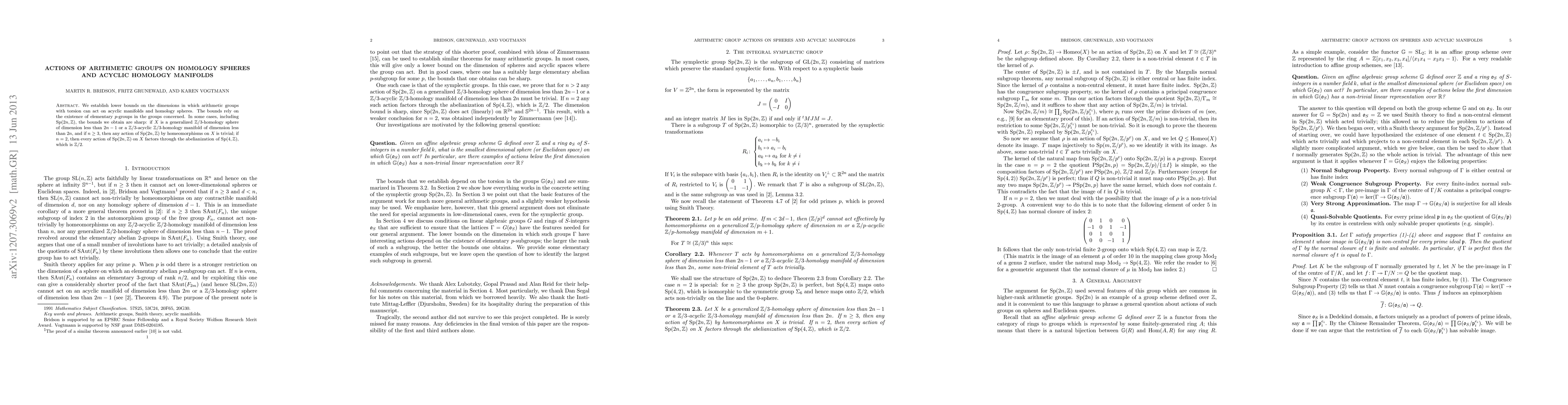 This paper establishes lower bounds for the dimensions in which arithmetic groups with torsion can act on acyclic manifolds and homology spheres, demonstrating that such actions are trivial unless specific dimension criteria are met, particularly for groups like Sp(2n,Z). For n ≥ 3, actions on generalized Z/3-homology spheres or Z/3-acyclic Z/3-homology manifolds below certain dimensions are shown to be trivial.