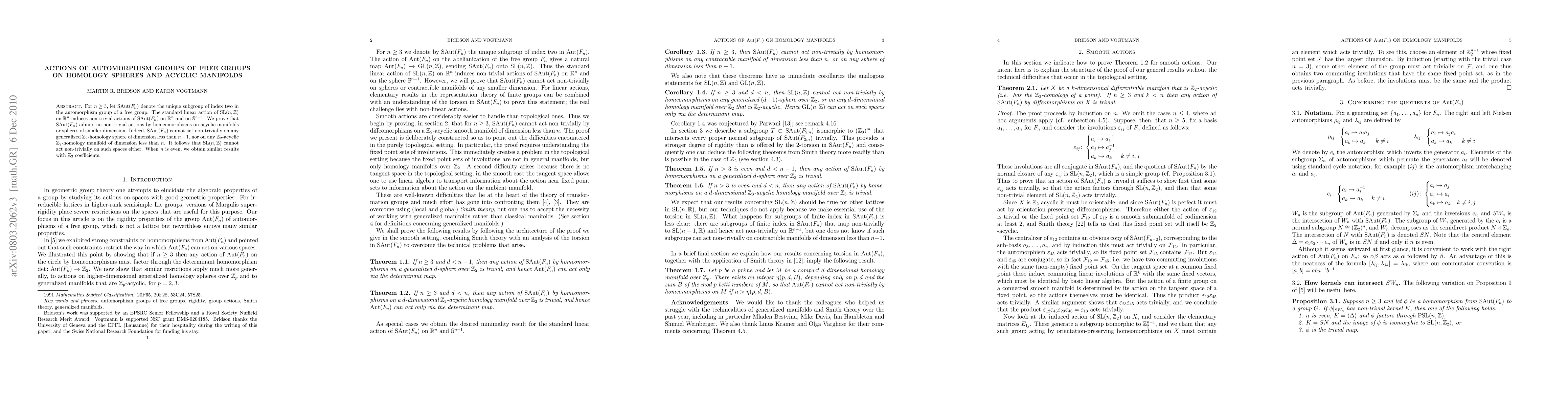 Summary: The paper demonstrates that the subgroup SAut(F_n) of the automorphism group of a free group of rank n ≥ 3 does not admit non-trivial homeomorphism actions on acyclic manifolds or homology spheres of dimensions less than n-1 or n respectively, using Z_2 coefficients, and similar results hold for n even with Z_3 coefficients.
