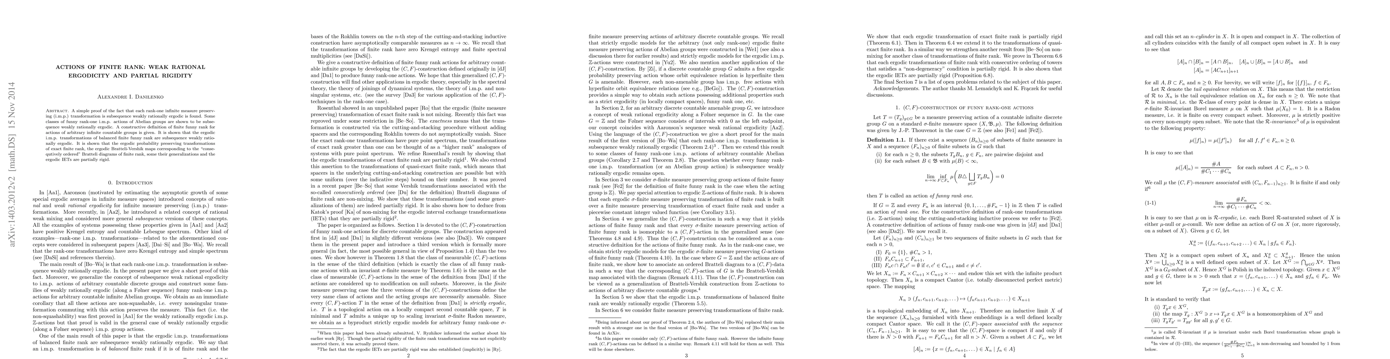 A simple proof of the fact that each rank-one infinite measure preserving (i.m.p.) transformation is subsequence weakly rationally ergodic is found. Some classes of funny rank-one i.m.p. actions of Abelian groups are shown to be subsequence weakly rationally ergodic. A constructive definition of finite funny rank for actions of arbitrary infinite countable groups is given. It is shown that the ergodic i.m.p. transformations of balanced finite funny rank are subsequence weakly rationally ergodic. It is shown that the ergodic probability preserving transformations of exact finite rank, the ergodic Bratteli-Vershik maps corresponding to the "consequtively ordered" Bratteli diagrams of finite rank, some their generalizations and the ergodic IETs are partially rigid.