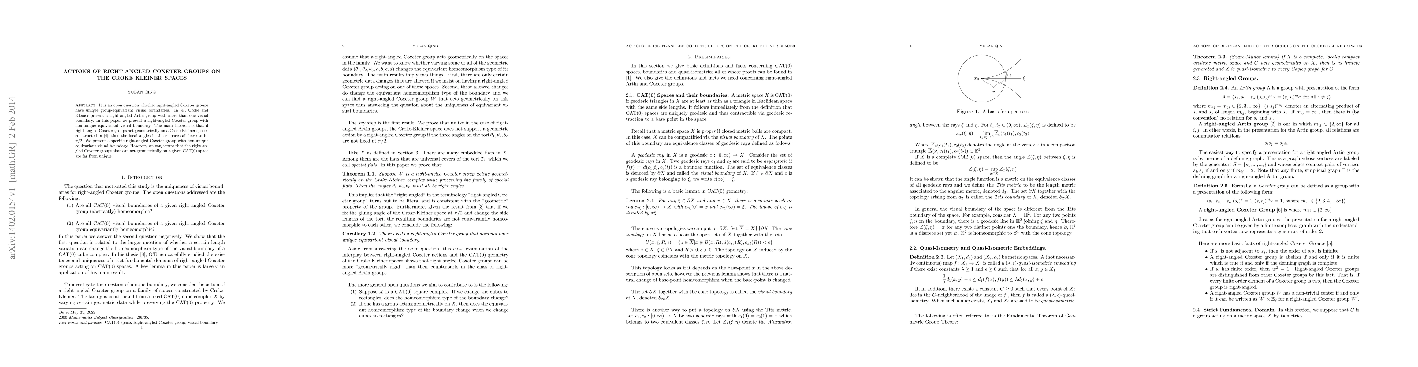This paper investigates right-angled Coxeter groups' actions on Croke-Kleiner spaces, demonstrating a group with a non-unique equivariant visual boundary. The main theorem posits that such groups acting geometrically on these spaces must have all local angles as right angles, suggesting a conjecture that these groups are not unique in their geometric actions.