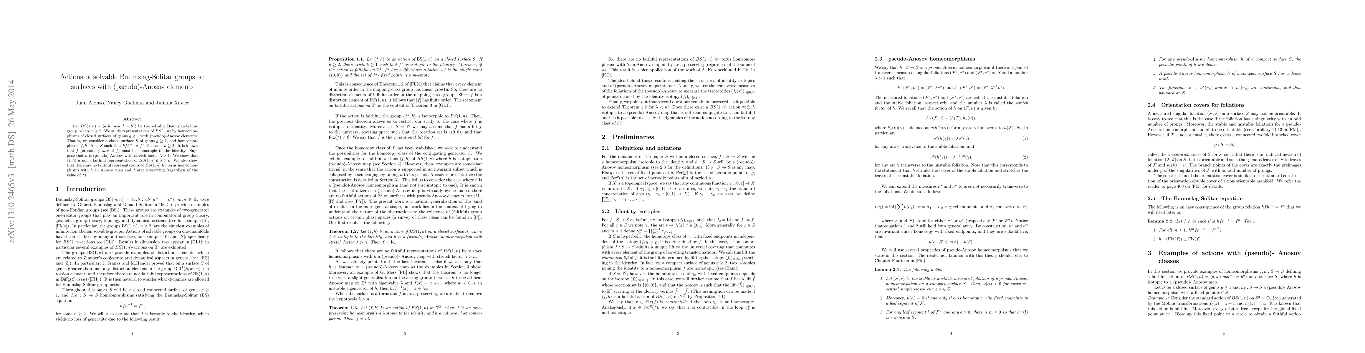 Researchers study how solvable Baumslag-Solitar groups act on surfaces with pseudo-Anosov elements, finding that certain conditions limit the group's representation to non-faithful maps.
