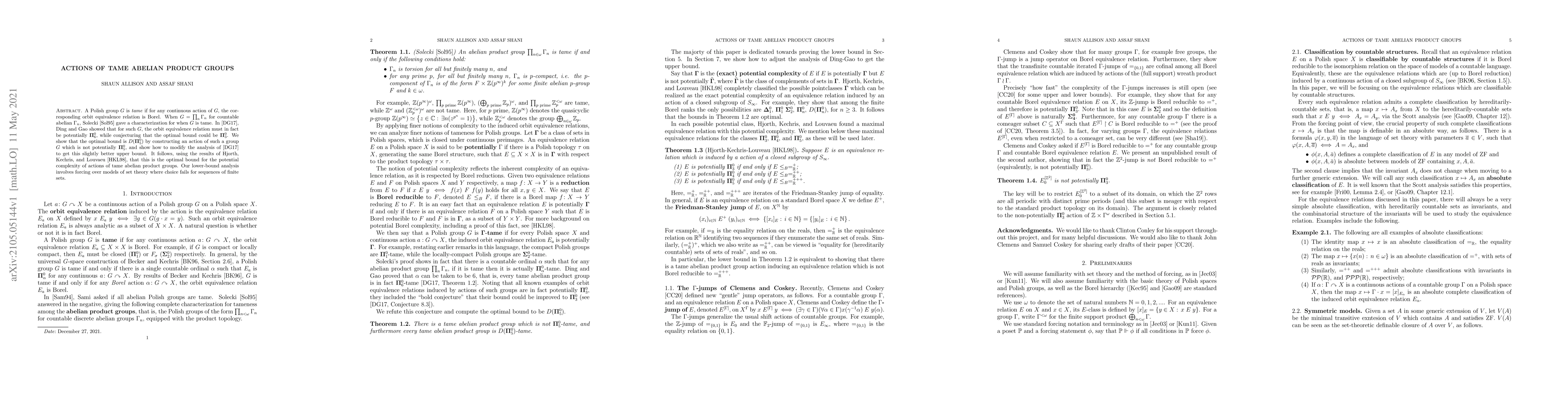 The paper analyzes actions of tame abelian product groups, characterizing when the orbit equivalence relation is Borel, and improving the complexity bound from potentially Π⁰₆ to D(Π⁰₅) for such actions.