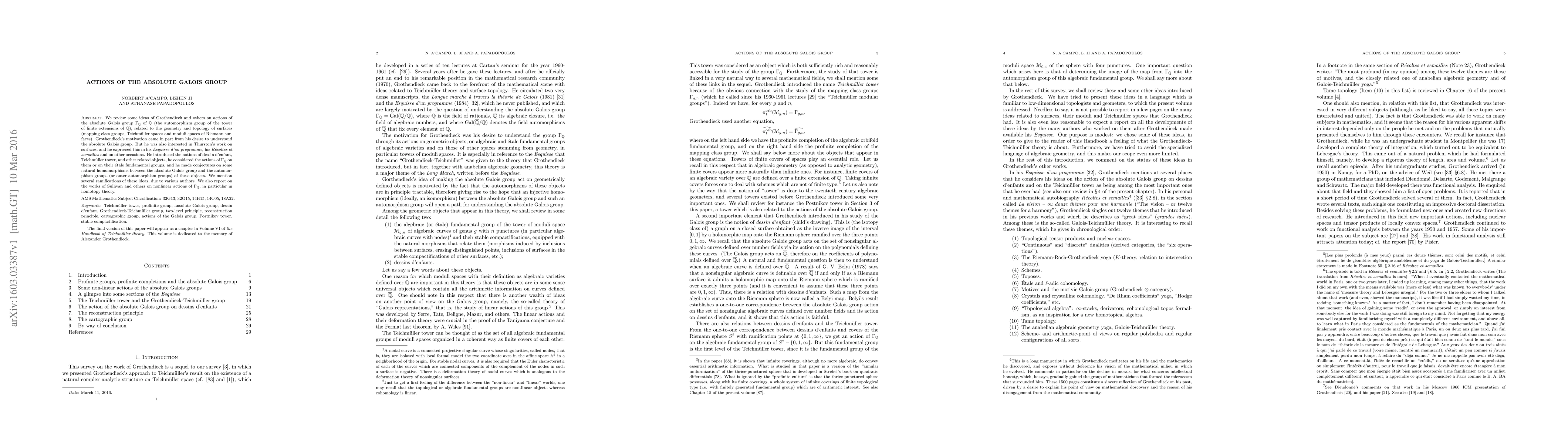 We review some ideas of Grothendieck and others on actions of the absolute Galois group {\Gamma} Q of Q (the automorphism group of the tower of finite extensions of Q), related to the geometry and topology of surfaces (mapping class groups, Teichm{\"u}ller spaces and moduli spaces of Riemann surfaces). Grothendieck's motivation came in part from his desire to understand the absolute Galois group. But he was also interested in Thurston's work on surfaces, and he expressed this in his Esquisse d'un programme, his R{\'e}coltes et semailles and on other occasions. He introduced the notions of dessin d'enfant, Teichm{\"u}ller tower, and other related objects, he considered the actions of {\Gamma} Q on them or on their etale fundamental groups, and he made conjectures on some natural homomorphisms between the absolute Galois group and the automor-phism groups (or outer automorphism groups) of these objects. We mention several ramifications of these ideas, due to various authors. We also report on the works of Sullivan and others on nonlinear actions of {\Gamma} Q , in particular in homotopy theory. The final version of this paper will appear as a chapter in Volume VI of the Handbook of Teichm{\"u}ller theory. This volume is dedicated to the memory of Alexander Grothendieck.