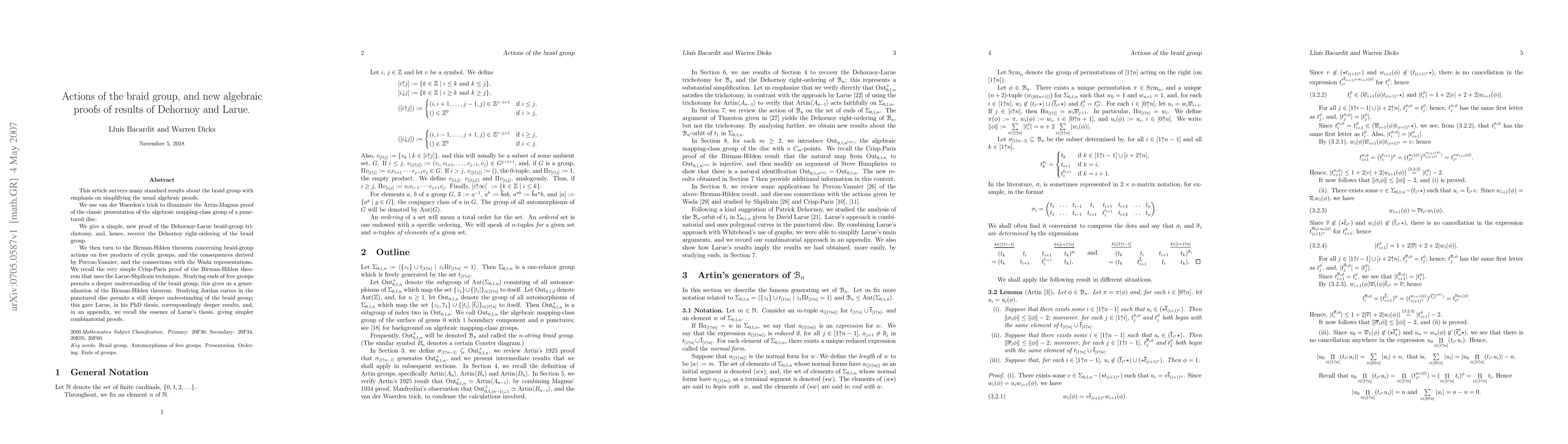 This article surveys many standard results about the braid group with emphasis on simplifying the usual algebraic proofs. We use van der Waerden's trick to illuminate the Artin-Magnus proof of the classic presentation of the algebraic mapping-class group of a punctured disc. We give a simple, new proof of the Dehornoy-Larue braid-group trichotomy, and, hence, recover the Dehornoy right-ordering of the braid group. We then turn to the Birman-Hilden theorem concerning braid-group actions on free products of cyclic groups, and the consequences derived by Perron-Vannier, and the connections with the Wada representations. We recall the very simple Crisp-Paris proof of the Birman-Hilden theorem that uses the Larue-Shpilrain technique. Studying ends of free groups permits a deeper understanding of the braid group; this gives us a generalization of the Birman-Hilden theorem. Studying Jordan curves in the punctured disc permits a still deeper understanding of the braid group; this gave Larue, in his PhD thesis, correspondingly deeper results, and, in an appendix, we recall the essence of Larue's thesis, giving simpler combinatorial proofs.