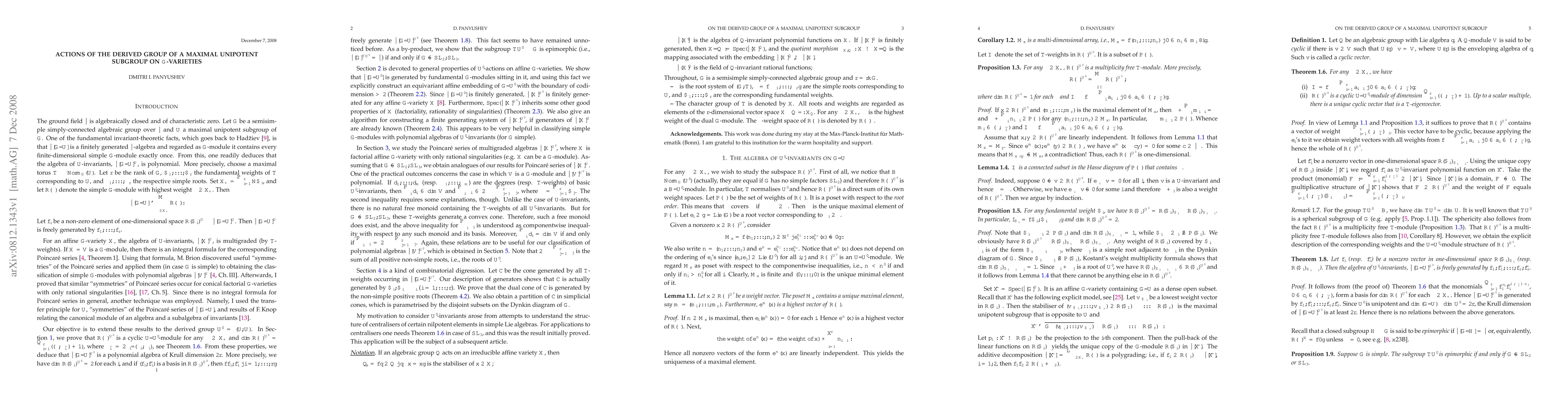 This paper investigates the actions of the derived group $U'$ of a maximal unipotent subgroup $U$ in a connected semisimple group $G$ on $G$-varieties. It demonstrates that $k[G/U]^{U'}$ is a polynomial algebra with Krull dimension $2r$, where $r$ is the rank of $G$, and shows that $V^{U'}$ is cyclic for any simple $G$-module $V$. Additionally, it classifies simple $G$-modules with polynomial algebras of $U'$-invariants for simple $G$.