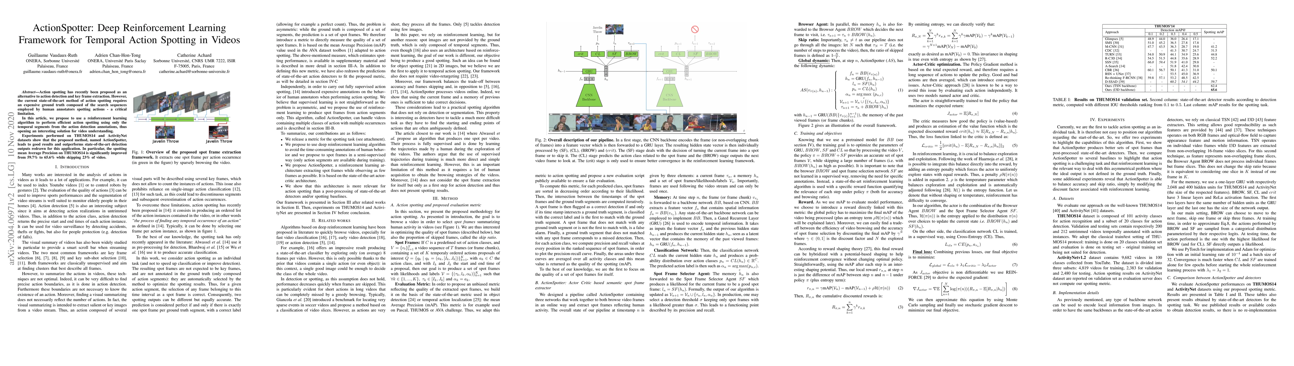 Summarizing video content is an important task in many applications. This task can be defined as the computation of the ordered list of actions present in a video. Such a list could be extracted using action detection algorithms. However, it is not necessary to determine the temporal boundaries of actions to know their existence. Moreover, localizing precise boundaries usually requires dense video analysis to be effective. In this work, we propose to directly compute this ordered list by sparsely browsing the video and selecting one frame per action instance, task known as action spotting in literature. To do this, we propose ActionSpotter, a spotting algorithm that takes advantage of Deep Reinforcement Learning to efficiently spot actions while adapting its video browsing speed, without additional supervision. Experiments performed on datasets THUMOS14 and ActivityNet show that our framework outperforms state of the art detection methods. In particular, the spotting mean Average Precision on THUMOS14 is significantly improved from 59.7% to 65.6% while skipping 23% of video.