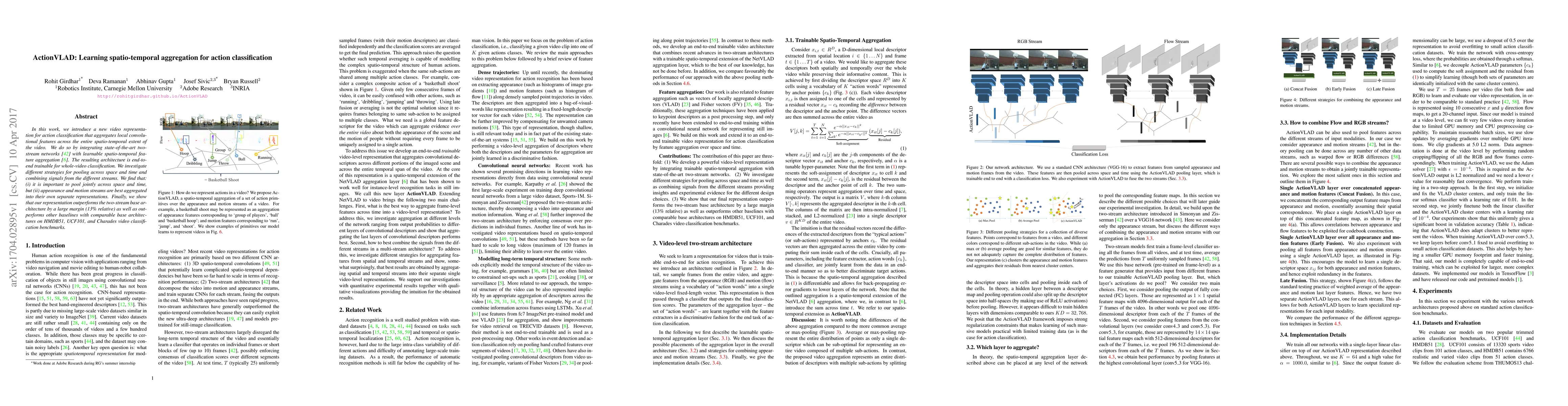 This paper introduces ActionVLAD, a new video representation method that combines convolutional features across space and time for action classification. It outperforms the two-stream baseline and other methods on multiple video classification benchmarks by integrating learnable spatio-temporal aggregation and separate aggregation of appearance and motion streams.
