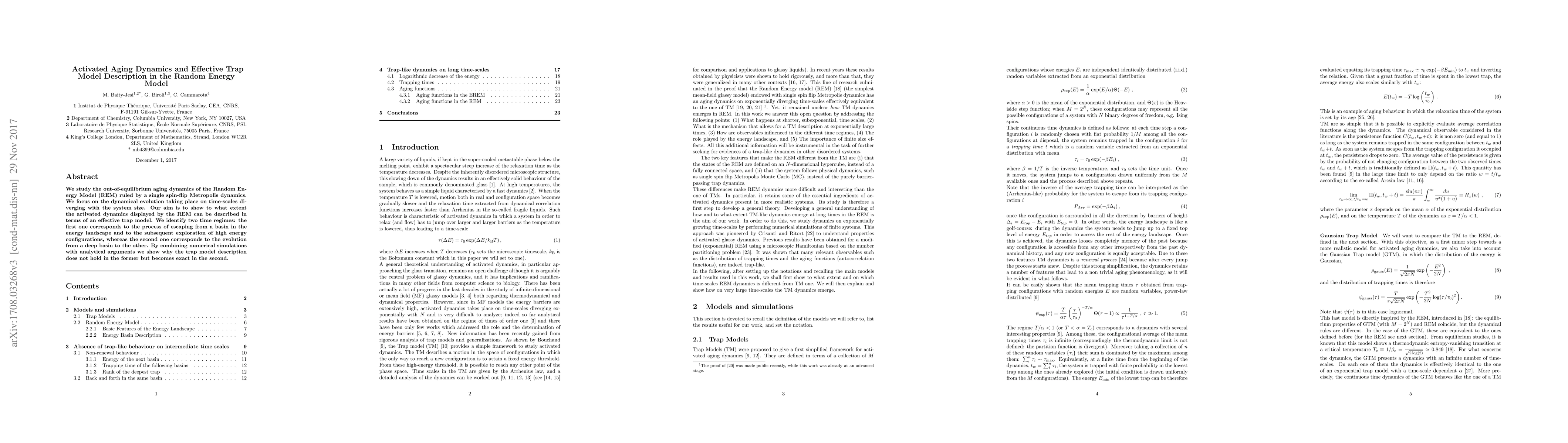 This paper investigates the aging dynamics in the Random Energy Model under single spin-flip Metropolis dynamics, identifying two time regimes. While the model's activated dynamics do not conform to an effective trap model during the initial escape process, it accurately describes the dynamics during transitions between deep energy basins.
