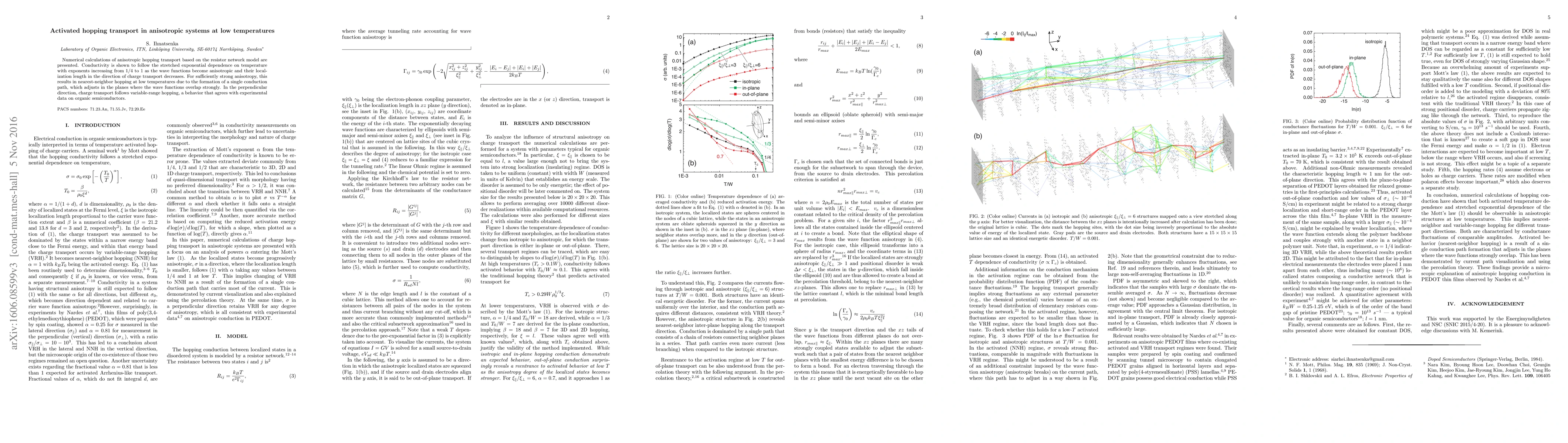 This paper investigates anisotropic hopping transport in low-temperature systems, revealing that conductivity follows a stretched exponential temperature dependence. Strong anisotropy leads to nearest-neighbor hopping in the conduction plane and variable-range hopping perpendicularly, aligning with organic semiconductor experimental data.