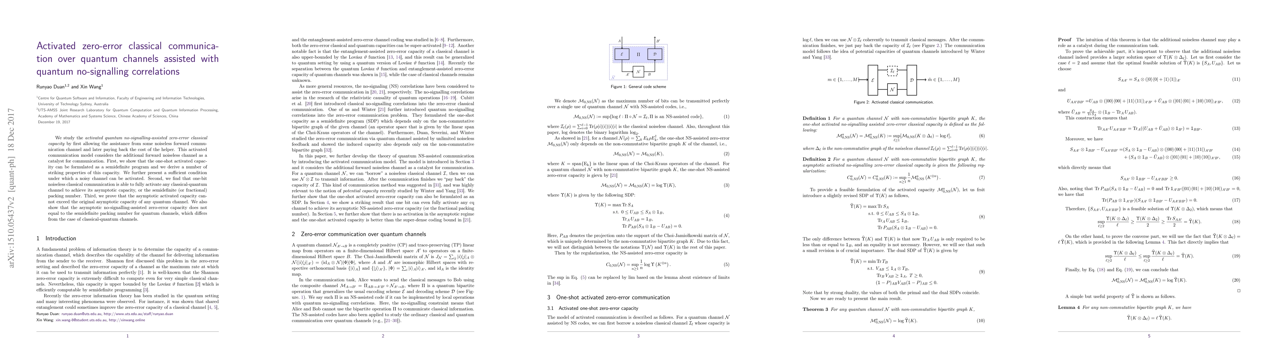 This paper investigates the activated zero-error classical communication over quantum channels using quantum no-signalling correlations and a noiseless forward channel. It demonstrates that one-bit noiseless classical communication can fully activate any classical-quantum channel to achieve its asymptotic capacity.