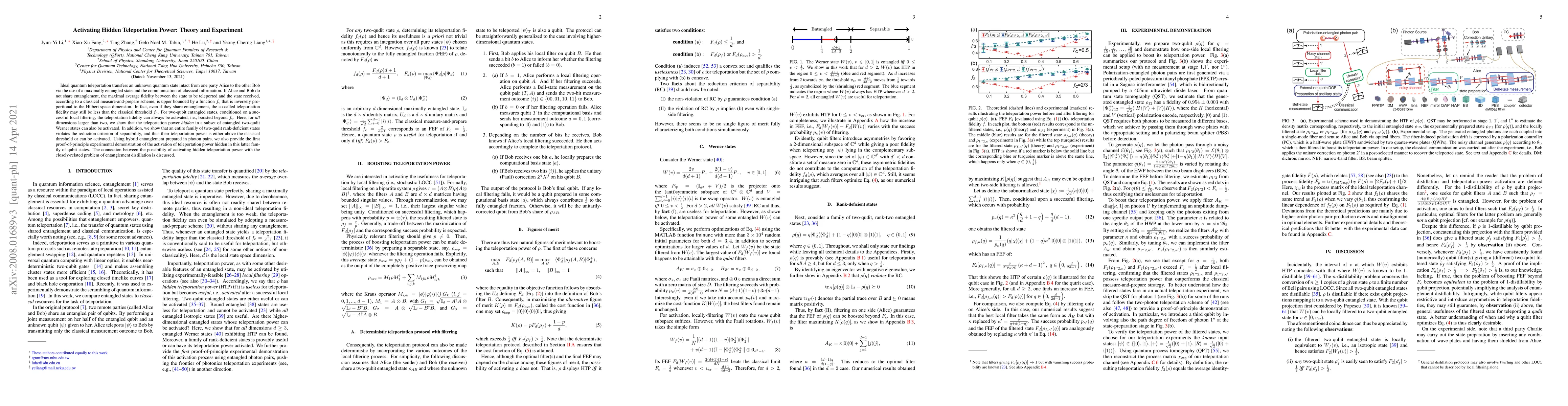 This paper explores the activation of hidden teleportation power in quantum states, demonstrating that for entangled two-qudit Werner states and rank-deficient states, the teleportation fidelity can exceed classical limits. Experimentally, it provides proof-of-principle using hybrid entanglement in photon pairs.