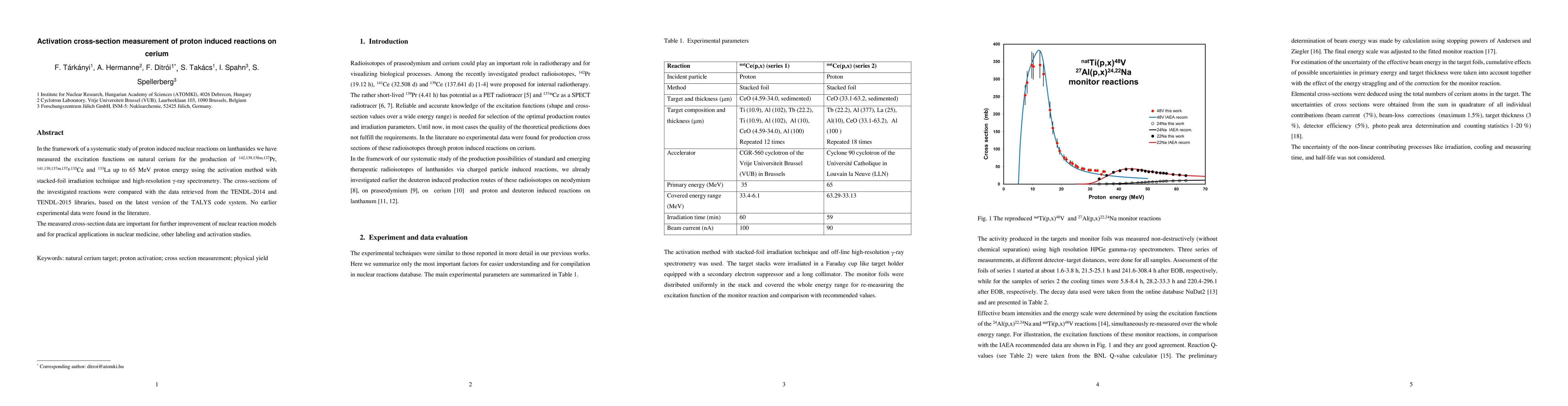 This study measures the activation cross-sections for proton-induced nuclear reactions on cerium up to 65 MeV, providing new data for 14 isotopes and comparing them with TENDL libraries. The results are crucial for refining nuclear reaction models and applications in nuclear medicine.