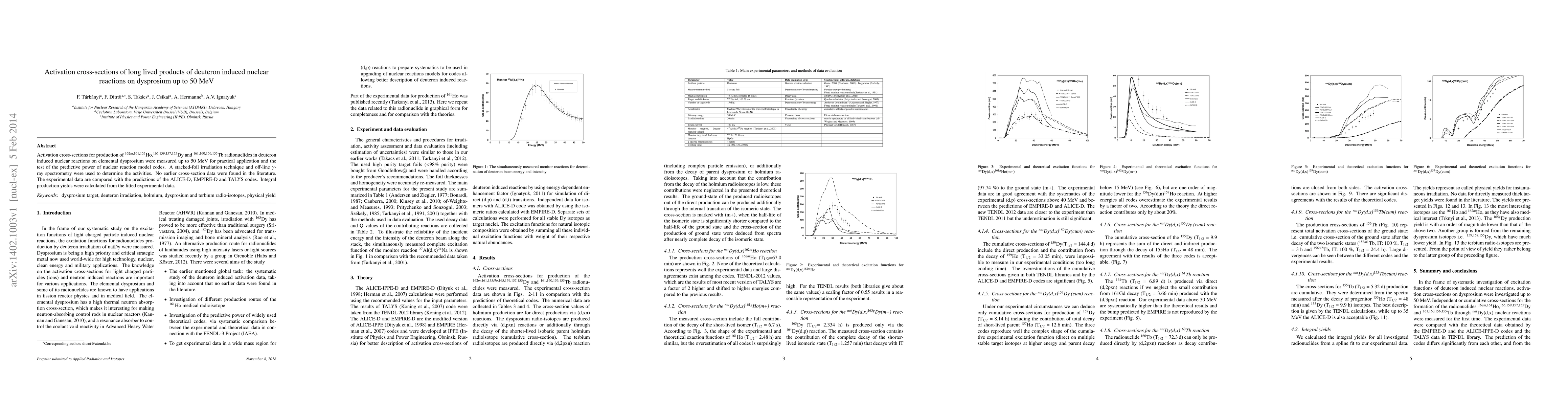 Activation cross-sections for production of 162m,161,155Ho,165,159,157,155Dy and 161,160,156,155Tb radionuclides in deuteron induced nuclear reactions on elemental dysprosium were measured up to 50 MeV for practical application and the test of the predictive power of nuclear reaction model codes. A stacked-foil irradiation technique and off-line gamma-ray spectrometry were used to determine the activities. No earlier cross-section data were found in the literature. The experimental data are compared with the predictions of the ALICE-D, EMPIRE-D and TALYS codes. Integral production yields were calculated from the fitted experimental data.