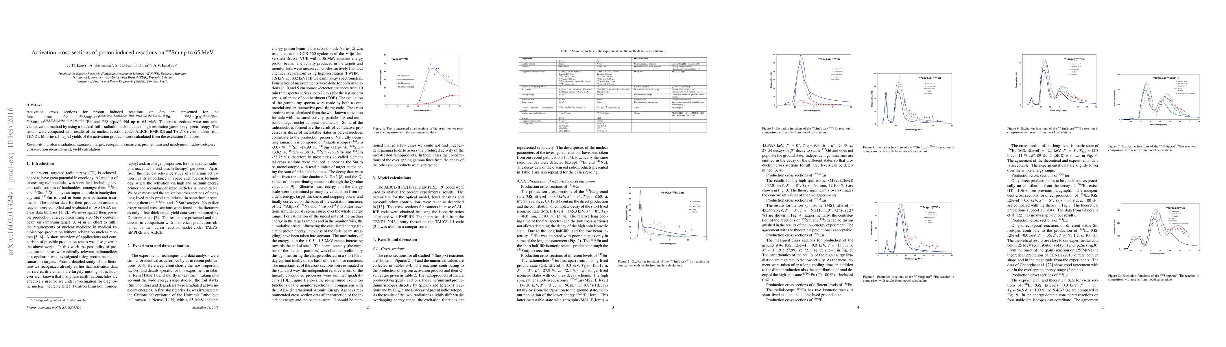 This paper presents, for the first time, activation cross sections for proton-induced reactions on natural samarium up to 65 MeV, measured using a stacked-foil irradiation technique and high-resolution gamma-ray spectroscopy. The results were compared with nuclear reaction codes and used to calculate integral yields of the activation products.