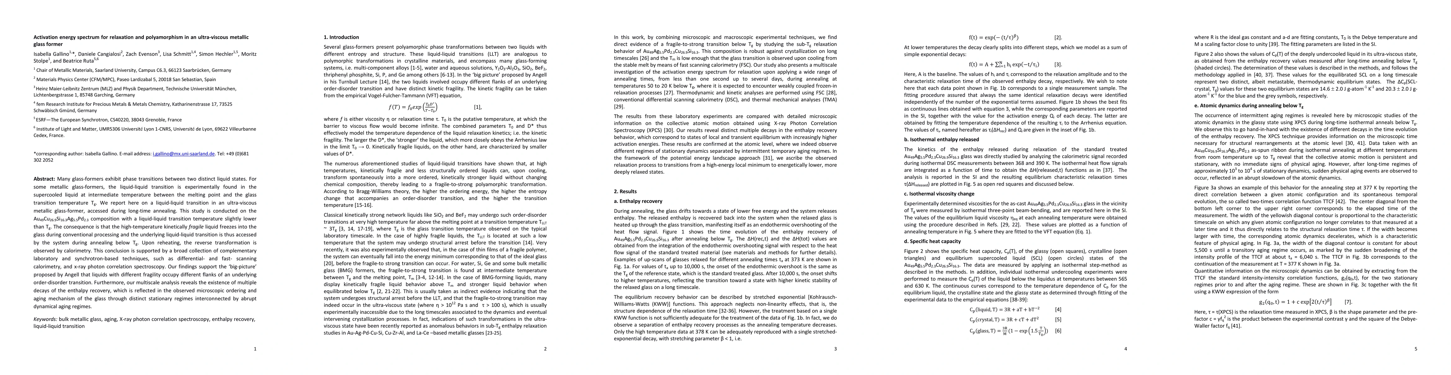 This study investigates a liquid-liquid transition in an ultra-viscous metallic glass-former, Au49Cu26.9Si16.3Ag5.5Pd2.3, observed during long-time annealing below the glass transition temperature Tg. The findings support Angell's theory of an underlying order-disorder transition and reveal multiple enthalpy recovery decays indicating distinct aging regimes.