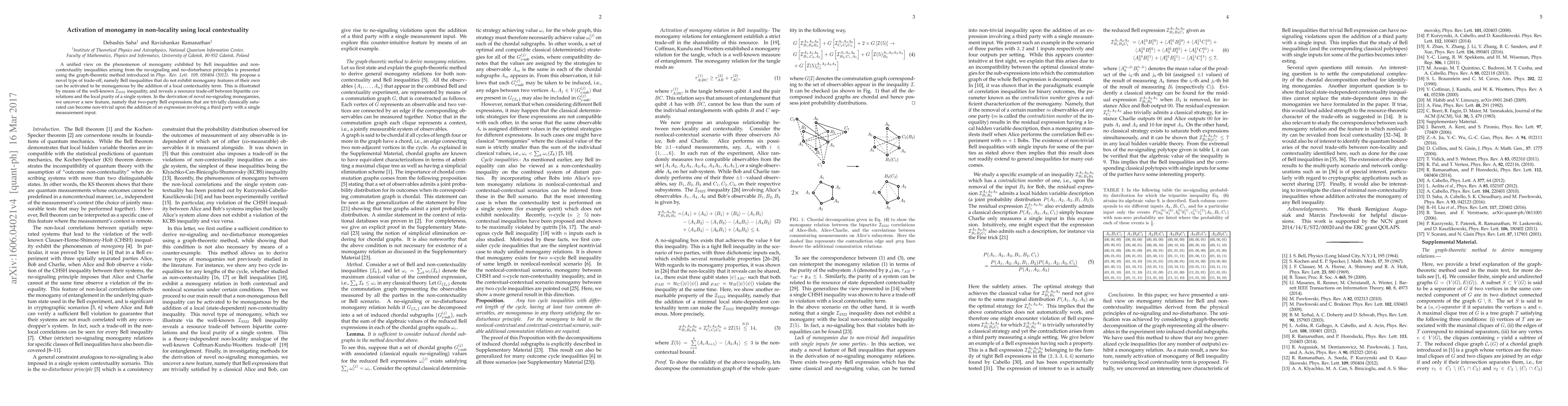 A unified view on the phenomenon of monogamy exhibited by Bell inequalities and non-contextuality inequalities arising from the no-signaling and no-disturbance principles is presented using the graph-theoretic method introduced in \textit{Phys. Rev. Lett. 109, 050404 (2012)}. We propose a novel type of trade-off, namely Bell inequalities that do not exhibit monogamy features of their own can be activated to be monogamous by the addition of a local contextuality term. This is illustrated by means of the well-known $\mathcal{I}_{3322}$ inequality, and reveals a resource trade-off between bipartite correlations and the local purity of a single system. In the derivation of novel no-signaling monogamies, we uncover a new feature, namely that two-party Bell expressions that are trivially classically saturated can become non-trivial upon the addition of an expression involving a third party with a single measurement input.