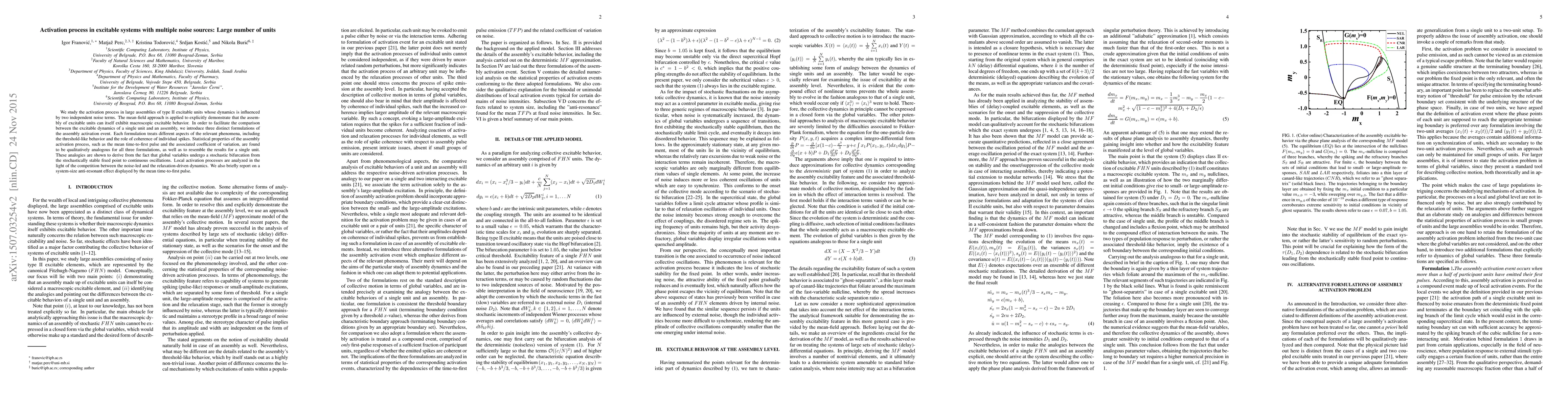This paper investigates the activation process in large assemblies of type II excitable units under the influence of two independent noise sources. It demonstrates that these assemblies can exhibit macroscopic excitable behavior, using mean-field approaches and three distinct formulations to compare single-unit and assembly dynamics, revealing analogous statistical properties and a stochastic bifurcation phenomenon.