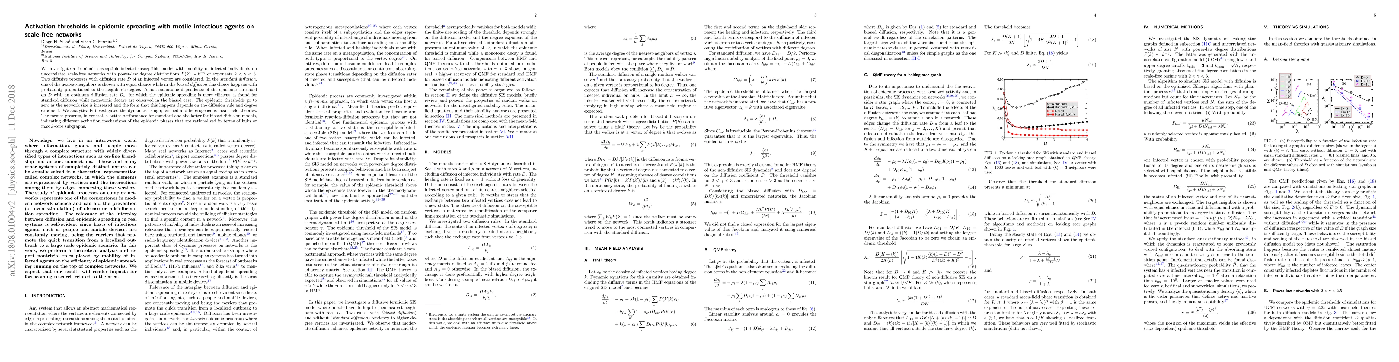 This paper examines epidemic spreading in a fermionic susceptible-infected-susceptible model on scale-free networks, considering two diffusion processes for infected individuals. It finds non-monotonic epidemic threshold behavior for standard diffusion and monotonic decay for biased diffusion, with different activation mechanisms rationalized by network hubs and $k$-core subgraphs.