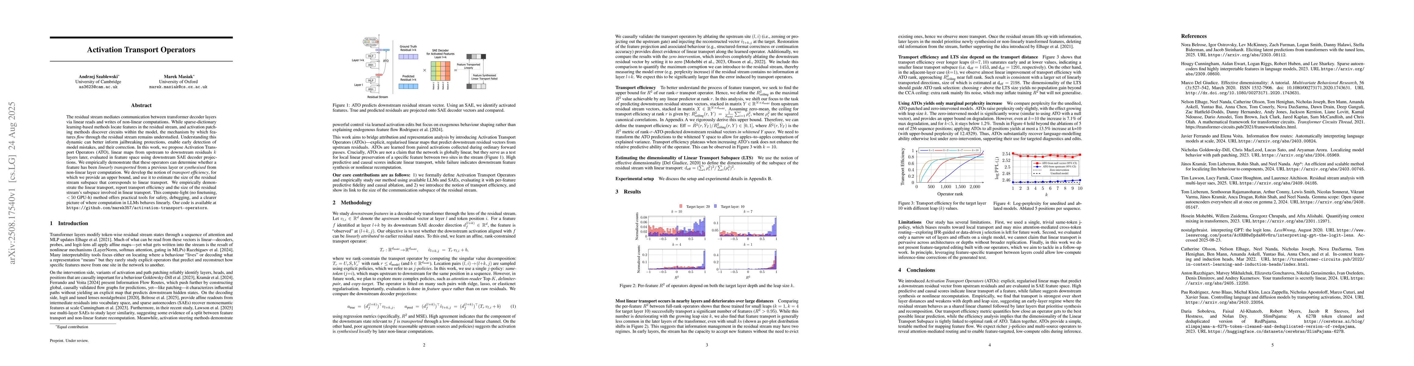 The residual stream mediates communication between transformer decoder layers via linear reads and writes of non-linear computations. While sparse-dictionary learning-based methods locate features in the residual stream, and activation patching methods discover circuits within the model, the mechanism by which features flow through the residual stream remains understudied. Understanding this dynamic can better inform jailbreaking protections, enable early detection of model mistakes, and their correction. In this work, we propose Activation Transport Operators (ATO), linear maps from upstream to downstream residuals $k$ layers later, evaluated in feature space using downstream SAE decoder projections. We empirically demonstrate that these operators can determine whether a feature has been linearly transported from a previous layer or synthesised from non-linear layer computation. We develop the notion of transport efficiency, for which we provide an upper bound, and use it to estimate the size of the residual stream subspace that corresponds to linear transport. We empirically demonstrate the linear transport, report transport efficiency and the size of the residual stream's subspace involved in linear transport. This compute-light (no finetuning, <50 GPU-h) method offers practical tools for safety, debugging, and a clearer picture of where computation in LLMs behaves linearly.