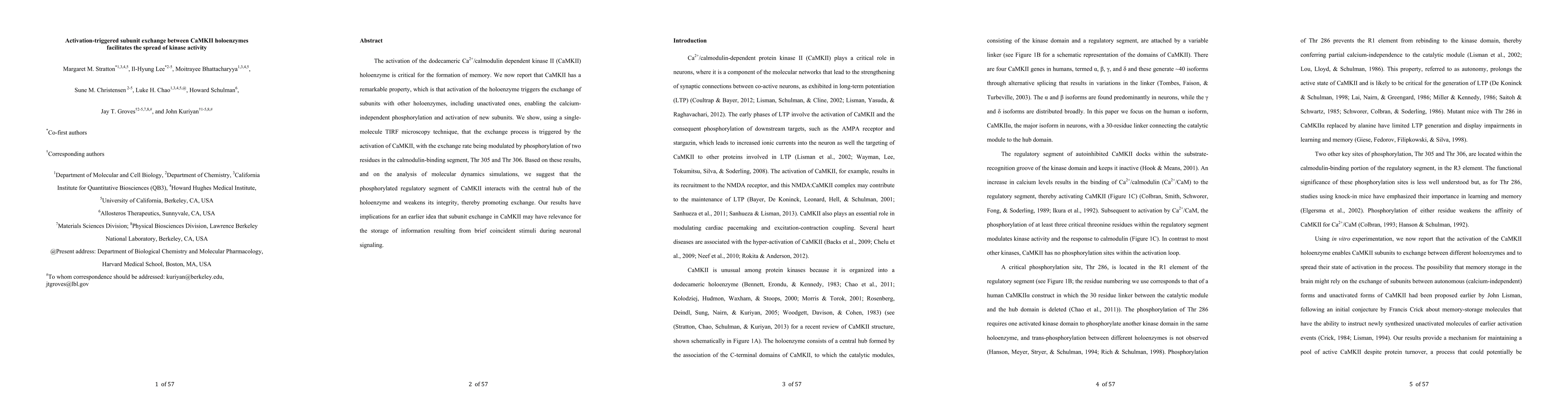 This paper reveals that activated CaMKII holoenzymes facilitate the exchange of subunits with other holoenzymes, spreading kinase activity. The exchange is modulated by phosphorylation of Thr 305 and Thr 306, which weakens the holoenzyme's integrity, promoting subunit exchange and potentially impacting memory storage.