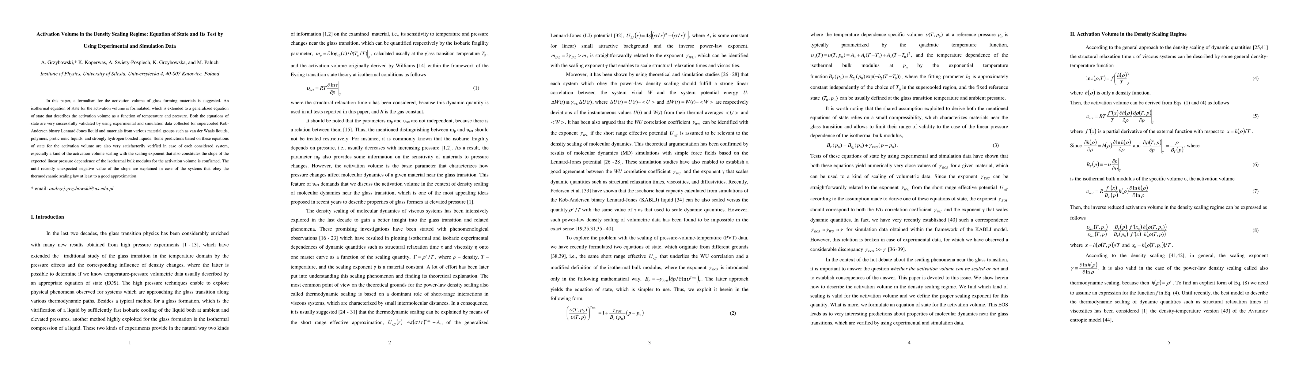 In this paper, a formalism for the activation volume of glass forming materials is suggested. An isothermal equation of state for the activation volume is formulated, which is extended to a generalized equation of state that describes the activation volume as a function of temperature and pressure. Both the equations of state are very successfully validated by using experimental and simulation data collected for supercooled Kob-Andersen binary Lennard-Jones liquid and materials from various material groups such as van der Waals liquids, polymers, protic ionic liquids, and strongly hydrogen bonded liquids. Some predictions based on these equations of state for the activation volume are also very satisfactorily verified in case of each considered system, especially a kind of the activation volume scaling with the scaling exponent that also constitutes the slope of the expected linear pressure dependence of the isothermal bulk modulus for the activation volume is confirmed. The until recently unexpected negative value of the slope are explained in case of the systems that obey the thermodynamic scaling law at least to a good approximation.