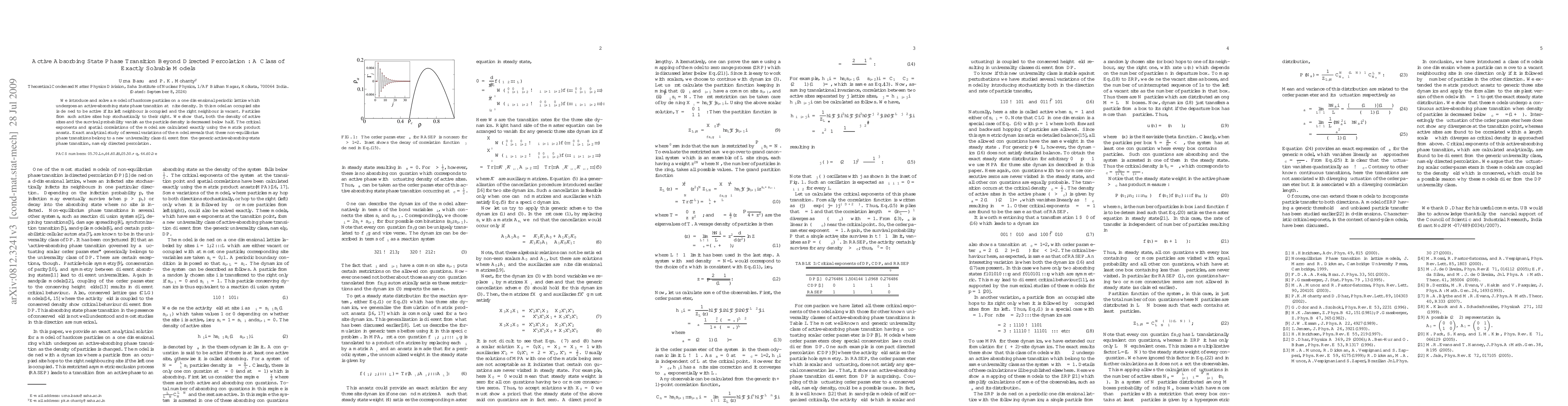 We introduce and solve a model of hardcore particles on a one dimensional periodic lattice which undergoes an active-absorbing state phase transition at finite density. In this model an occupied site is defined to be active if its left neighbour is occupied and the right neighbour is vacant. Particles from such active sites hop stochastically to their right. We show that, both the density of active sites and the survival probability vanish as the particle density is decreased below half. The critical exponents and spatial correlations of the model are calculated exactly using the matrix product ansatz. Exact analytical study of several variations of the model reveals that these non-equilibrium phase transitions belong to a new universality class different from the generic active-absorbing-state phase transition, namely directed percolation.
