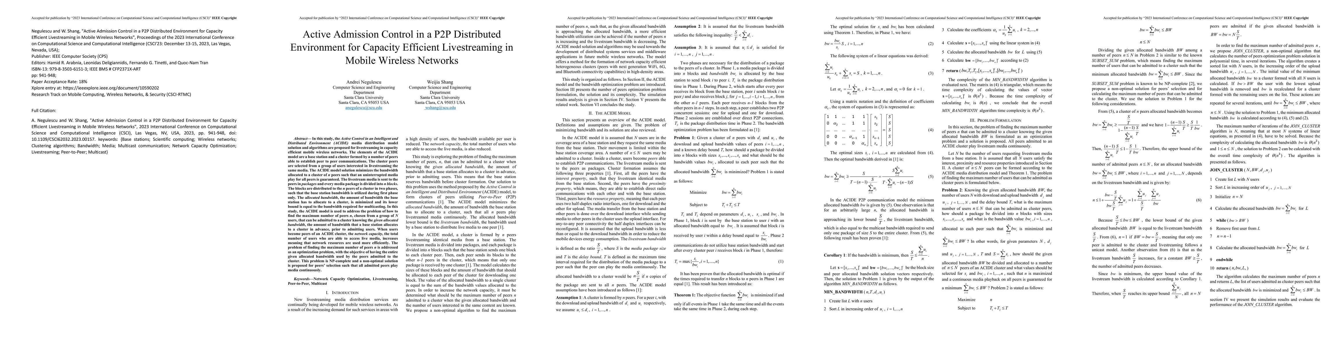 This paper proposes the ACIDE model for efficient livestreaming in mobile wireless networks, utilizing a base station and peer clusters to minimize bandwidth allocation. The model addresses the optimization problem of selecting the maximum number of peers that can be admitted to a cluster within a given bandwidth, ensuring continuous media play.