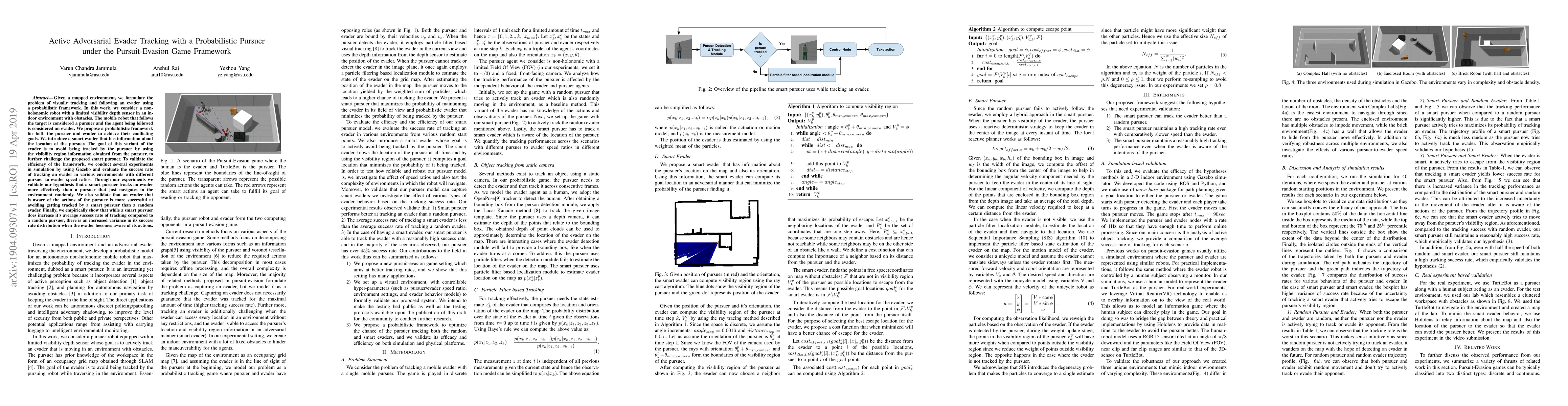 Given a mapped environment, we formulate the problem of visually tracking and following an evader using a probabilistic framework. In this work, we consider a non-holonomic robot with a limited visibility depth sensor in an indoor environment with obstacles. The mobile robot that follows the target is considered a pursuer and the agent being followed is considered an evader. We propose a probabilistic framework for both the pursuer and evader to achieve their conflicting goals. We introduce a smart evader that has information about the location of the pursuer. The goal of this variant of the evader is to avoid being tracked by the pursuer by using the visibility region information obtained from the pursuer, to further challenge the proposed smart pursuer. To validate the efficiency of the framework, we conduct several experiments in simulation by using Gazebo and evaluate the success rate of tracking an evader in various environments with different pursuer to evader speed ratios. Through our experiments we validate our hypothesis that a smart pursuer tracks an evader more effectively than a pursuer that just navigates in the environment randomly. We also validate that an evader that is aware of the actions of the pursuer is more successful at avoiding getting tracked by a smart pursuer than a random evader. Finally, we empirically show that while a smart pursuer does increase it's average success rate of tracking compared to a random pursuer, there is an increased variance in its success rate distribution when the evader becomes aware of its actions.