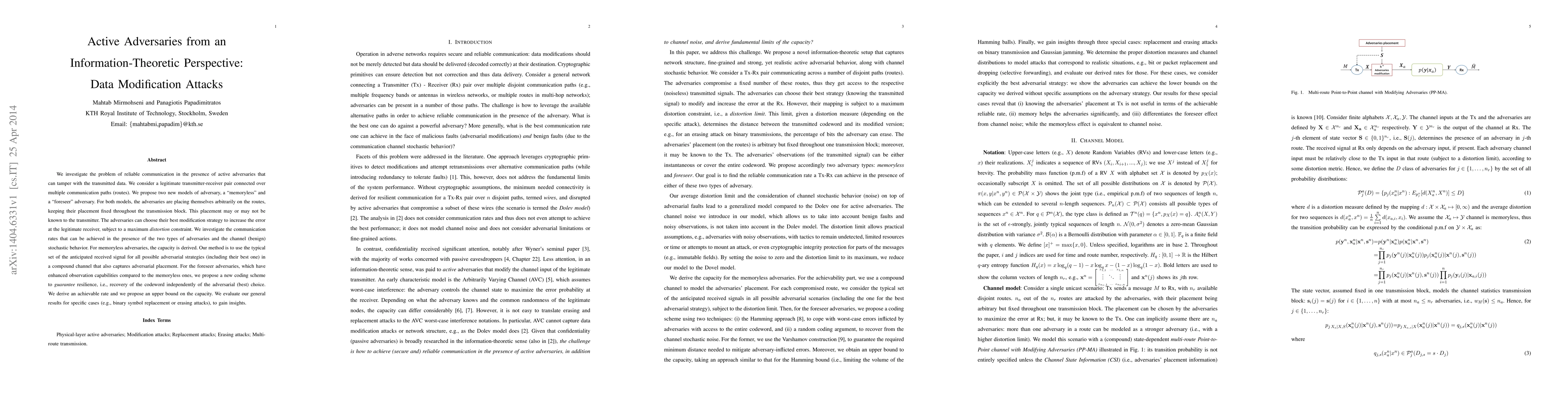We investigate the problem of reliable communication in the presence of active adversaries that can tamper with the transmitted data. We consider a legitimate transmitter-receiver pair connected over multiple communication paths (routes). We propose two new models of adversary, a "memoryless" and a "foreseer" adversary. For both models, the adversaries are placing themselves arbitrarily on the routes, keeping their placement fixed throughout the transmission block. This placement may or may not be known to the transmitter. The adversaries can choose their best modification strategy to increase the error at the legitimate receiver, subject to a maximum distortion constraint. We investigate the communication rates that can be achieved in the presence of the two types of adversaries and the channel (benign) stochastic behavior. For memoryless adversaries, the capacity is derived. Our method is to use the typical set of the anticipated received signal for all possible adversarial strategies (including their best one) in a compound channel that also captures adversarial placement. For the foreseer adversaries, which have enhanced observation capabilities compared to the memoryless ones, we propose a new coding scheme to guarantee resilience, i.e., recovery of the codeword independently of the adversarial (best) choice. We derive an achievable rate and we propose an upper bound on the capacity. We evaluate our general results for specific cases (e.g., binary symbol replacement or erasing attacks), to gain insights.