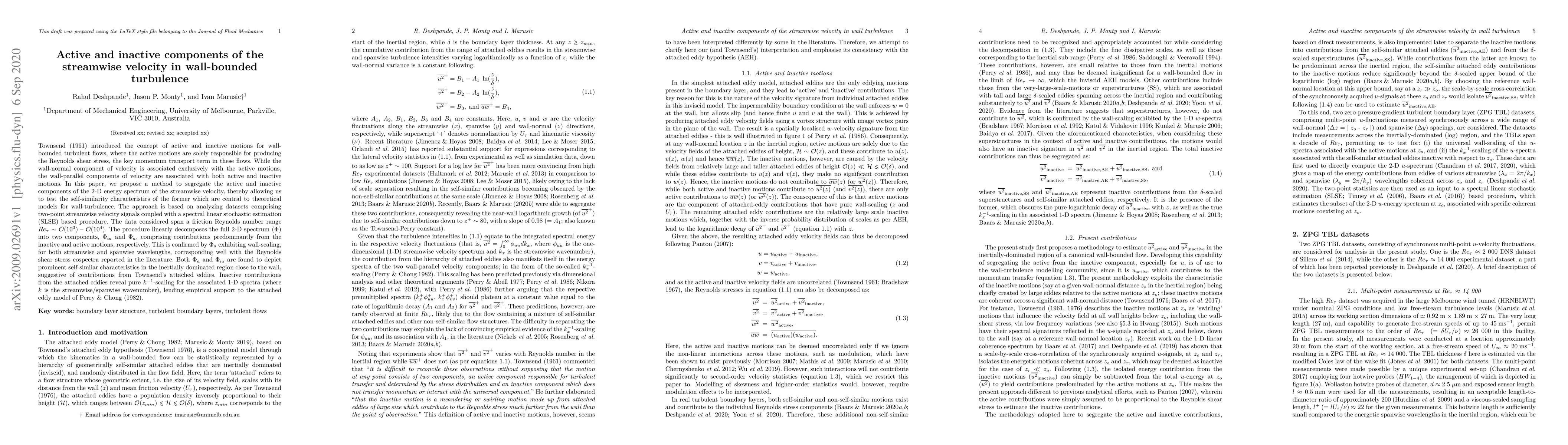 This paper proposes a method to distinguish active and inactive components of the streamwise velocity in wall-bounded turbulence, using spectral analysis and SLSE. The active component, responsible for Reynolds shear stress, shows self-similar characteristics near the wall, supporting theoretical models, while the inactive component aligns with Perry & Chong's attached eddy model.